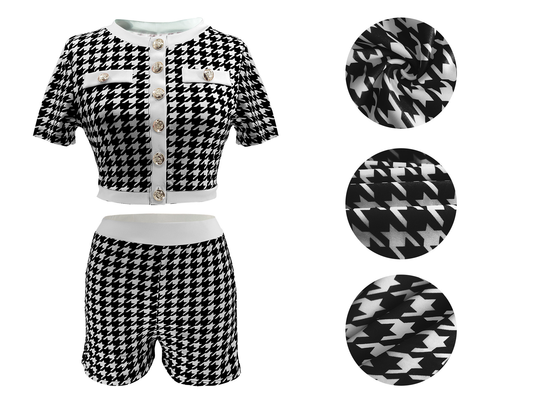This Women's Fashion Houndstooth Short-Sleeved Tops Tight Fitting Shorts Set Design Made Of High Quality polyester And Spandex Material. It Is Stretchy, Durable And Comfortable. It Come With The Top And Shorts. retail Short Sets Saves Some People From The Trouble Of Matching. And For Matchmakers It Is More Flexible Than One-Piece Outfit. Two Piece Short Set Can Be Worn Together Or Individually, Ladies Can Match Them According To Different Occasions. Grab Different Two Piece Short Sets For This Spring And Summer.