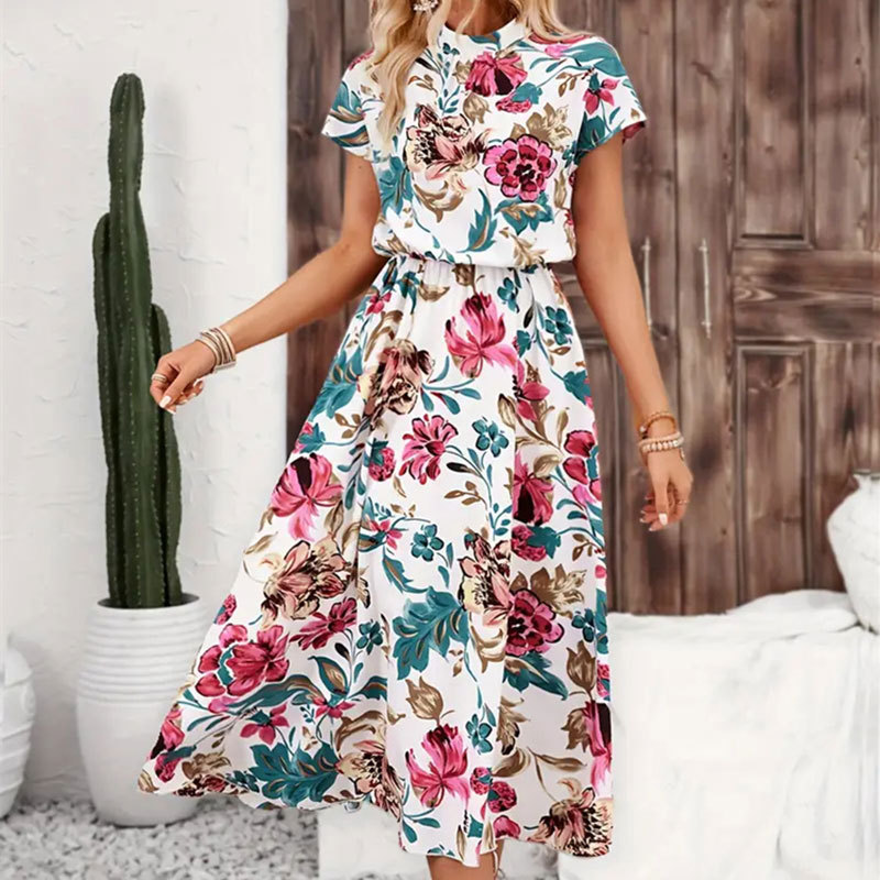 This Women's Flower Print Loose Stand Collar Short Sleeve Spring And Summer Midi Sdress Design Made Of High Quality polyester And Spandex Material. It Is Stretchy, Durable And Comfortable. Casual Dresses With Long Sleeves Can Not Only Be Worn As Outerwear In Spring And Autumn, But Also Matching a Jacket In Winter, It Is a Must Have Item For Every Season. Grab Really Great Buy Casual Dresses For Women And Grow Your Business. No Moq In BamBam.
