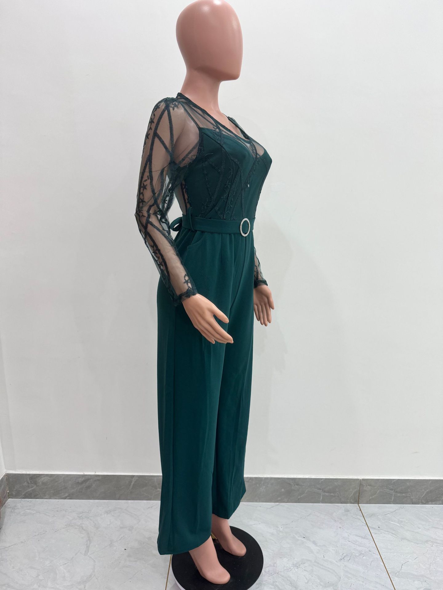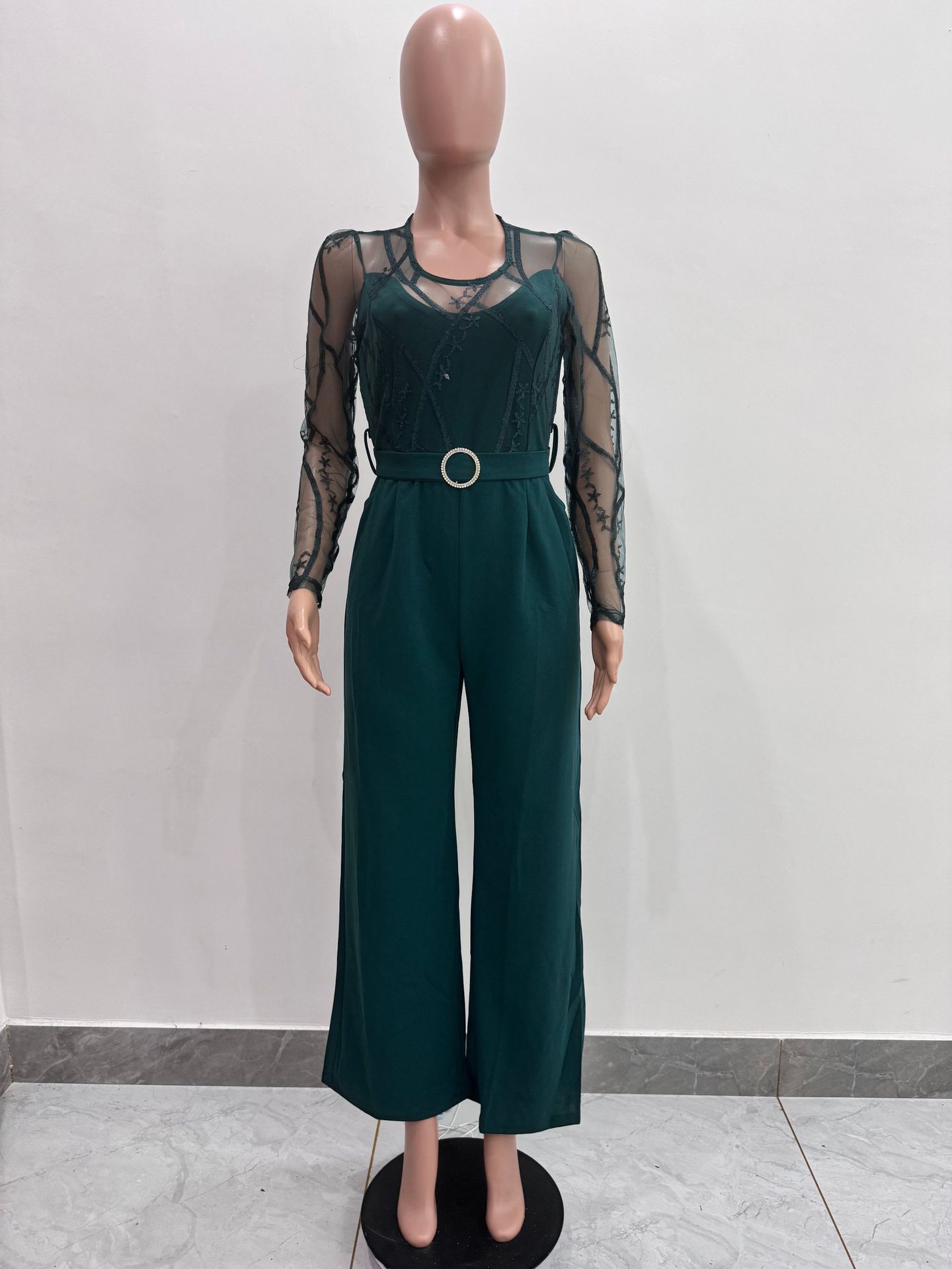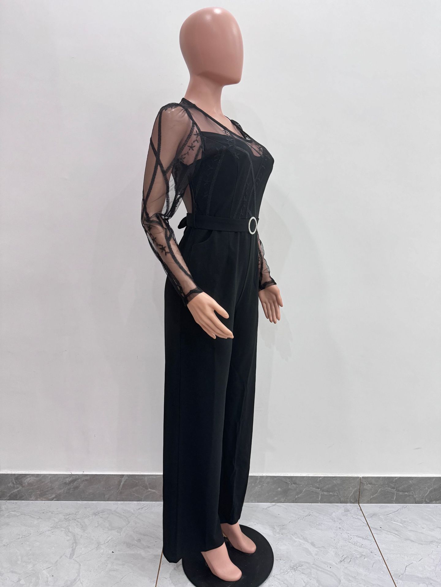 This Women's Mesh See-Through Patchwork Embroidery Sexy Jumpsuit (Includes Belt) Design Made Of High Quality Polyster And Spandex Material. It Is Stretchy, Durable And Comfortable. Affordable Sexy Jumpsuits For Women Has Long Been a Party Favorite. BamBam provides a Rich selection Of Sequin, Beaded, See Through Mesh, Leopard, Floral Lace, Leather, Velvet, Tight And Fitted retail Jumpsuit Without Moq Limit.