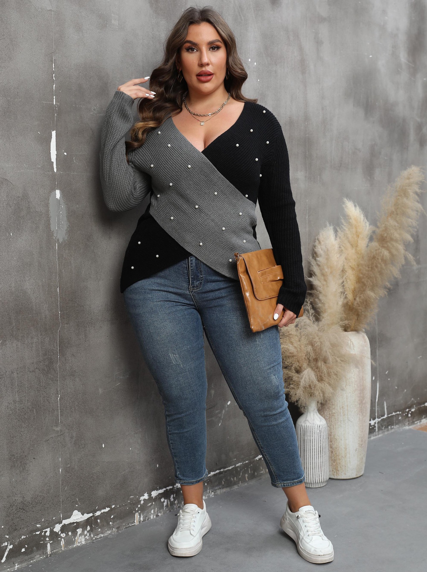 This Women's Pearl Plus Size Contrast Color Cross Deep v Neck Sexy Sweater Made Of Comfortable And stretchy Fabric. It Is retail Sexy Plus Size Tops For Women. With The Gradual Rise Of Feminist Awareness, The Mainstream Fashion Of "Beauty With Thinness" In The Past Can No Longer Dominate, BamBam Advocates That No Matter Whether The Body Is Thick Or Thin, We Are The Most Unique Existence. Ladies Can Also Show Off Their Figure Generously. BamBam Offer All Kinds Of retail Plus Size Blouses And Shirts At affordable Price And High Quality.