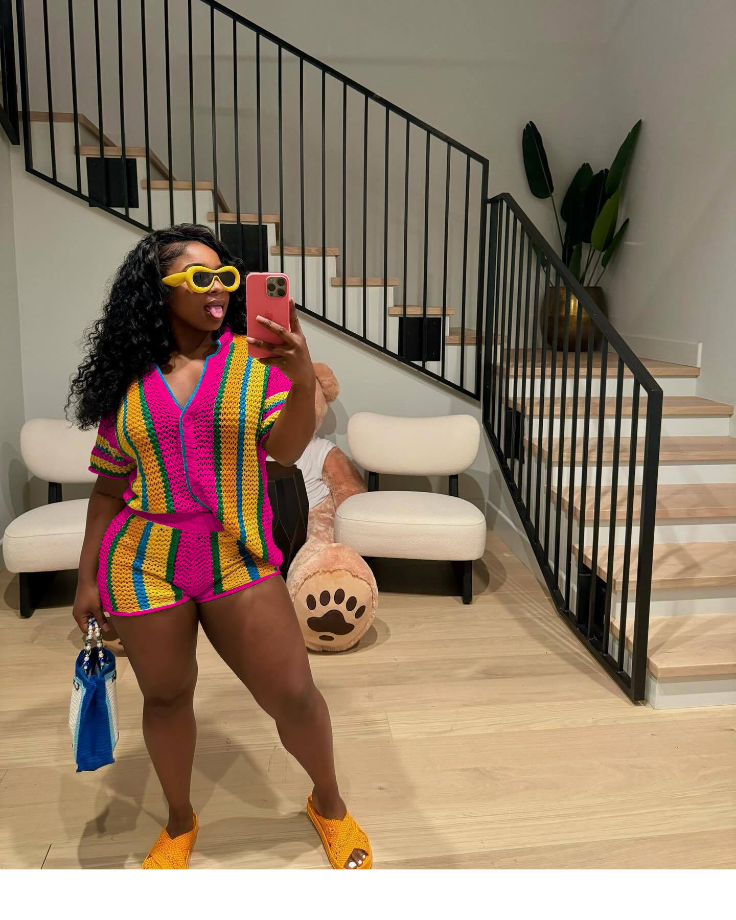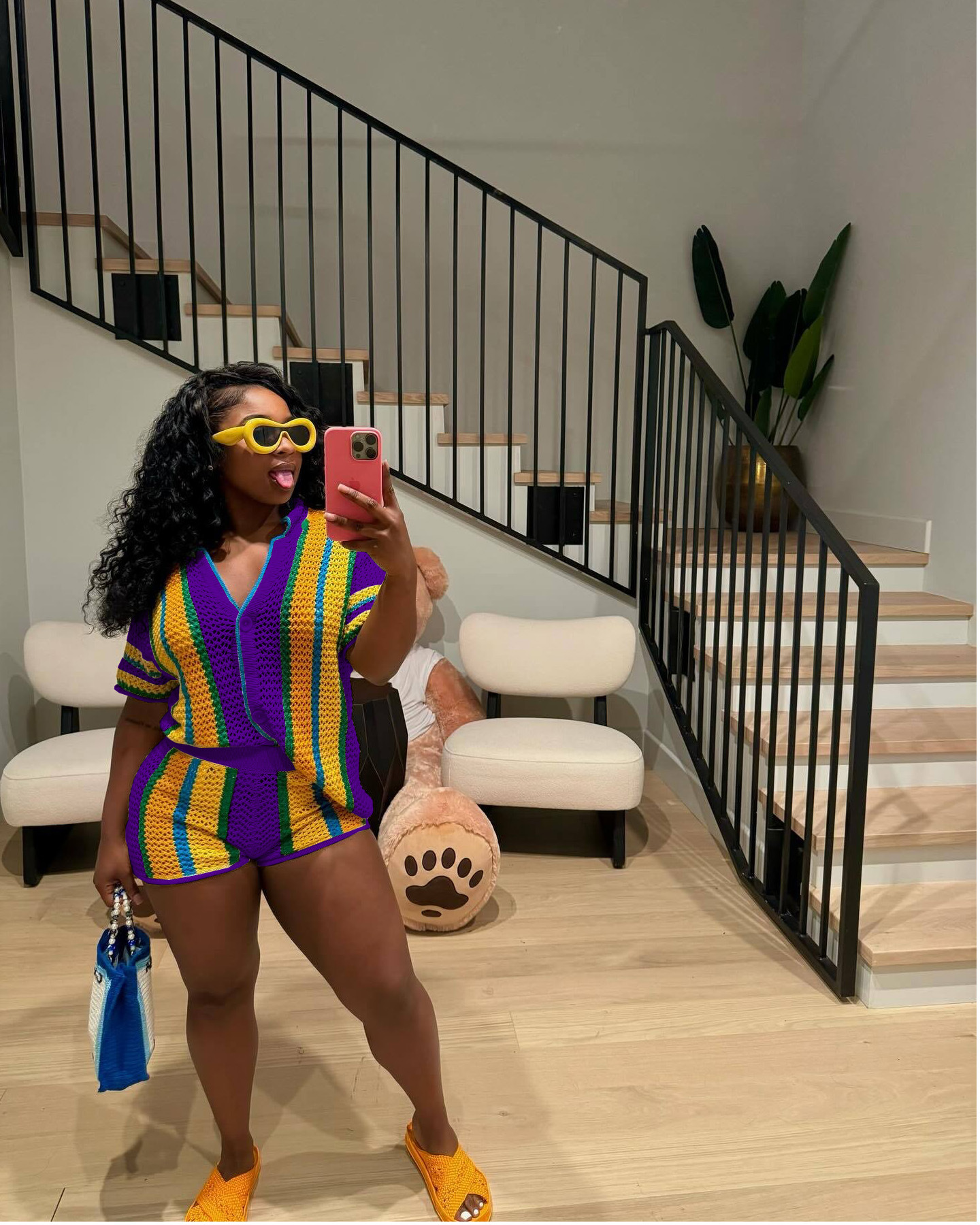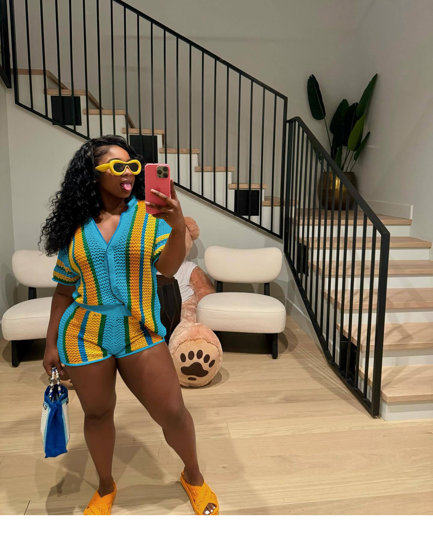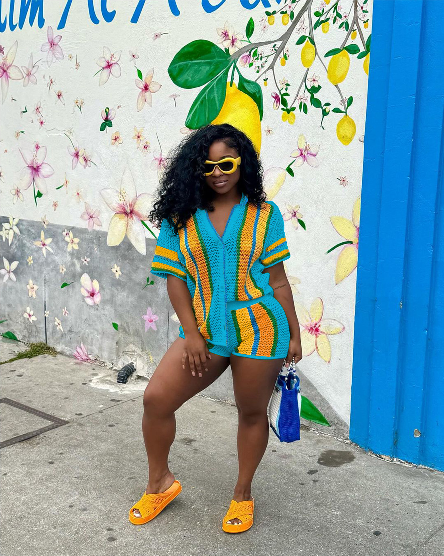 This Women's Sexy Hollow See-Through Turndown Collar Knitting Two Piece Shorts Set Design Made Of High Quality polyester And Spandex Material. It Is Stretchy, Durable And Comfortable. It Come With The Top And Shorts. retail Short Sets Saves Some People From The Trouble Of Matching. And For Matchmakers It Is More Flexible Than One-Piece Outfit. Two Piece Short Set Can Be Worn Together Or Individually, Ladies Can Match Them According To Different Occasions. Grab Different Two Piece Short Sets For This Spring And Summer.