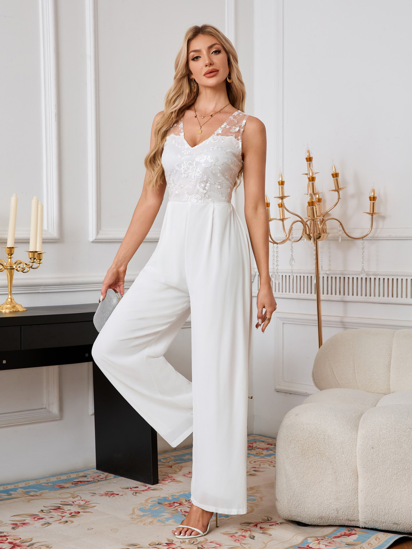 This Women's Sexy v-Neck Wide-Leg Wedding Formal Party White Chiffon Lace Jumpsuit Design Made Of High Quality Polyster And Spandex Material. It Is Stretchy, Durable And Comfortable. Affordable Sexy Jumpsuits For Women Has Long Been a Party Favorite. BamBam provides a Rich selection Of Sequin, Beaded, See Through Mesh, Leopard, Floral Lace, Leather, Velvet, Tight And Fitted retail Jumpsuit Without Moq Limit.