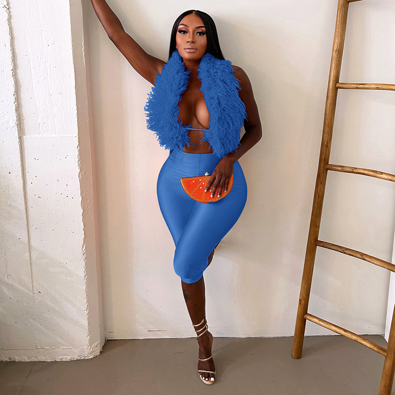 This Women's Spring/Summer Fuzzy Halter Neck Lace-Up Deep Low Back Top Tight-Fitting Pants Two-Piece Set Design Made Of High Quality polyester And Spandex Material. It Is Stretchy, Durable And Comfortable. It Come With The Top And Shorts. retail Short Sets Saves Some People From The Trouble Of Matching. And For Matchmakers It Is More Flexible Than One-Piece Outfit. Two Piece Short Set Can Be Worn Together Or Individually, Ladies Can Match Them According To Different Occasions. Grab Different Two Piece Short Sets For This Spring And Summer.