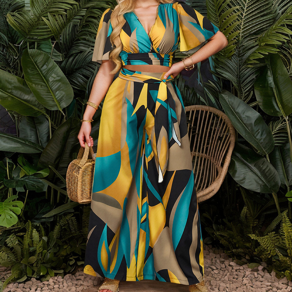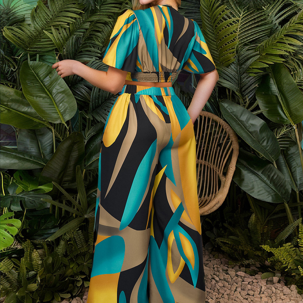This Women's Summer Casual Printed v-Neck Top And Wide Leg Pant Sets Design Made Of High Quality polyester And Spandex Material. It Is Stretchy, Durable And Comfortable. It Is a Must-Have Outfit For All Seasons. retail Two Piece Pant Sets Can Solve Your cloth selection Troubles. Explore More 2 Piece Pants Set On BamBam retail Women Clothing Online Store.