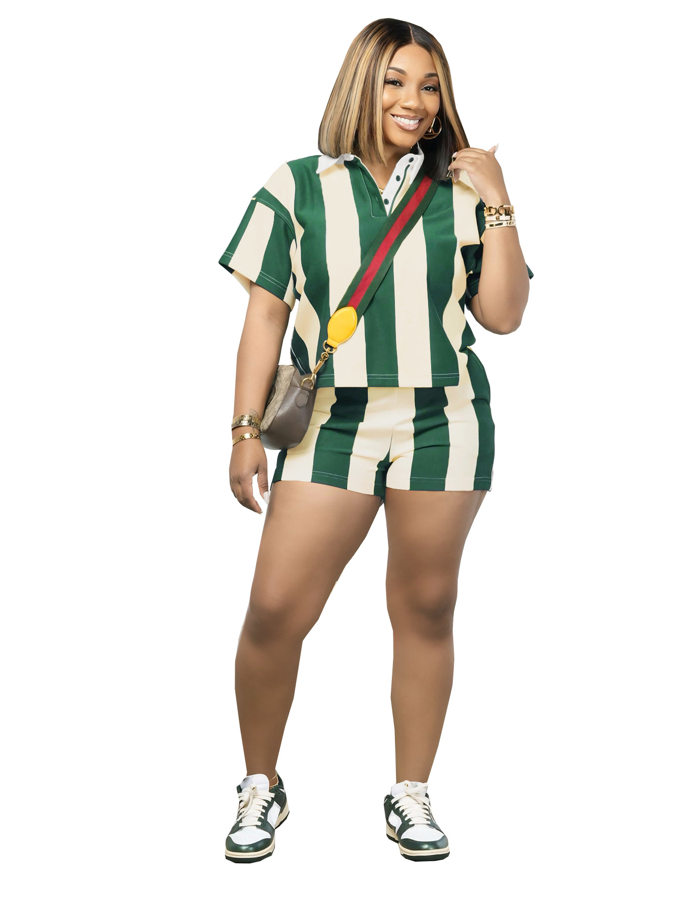 This Women's Summer Sports Casual Fashion Stripe Turndown Collar Short Sleeve High Waist Shorts Set Design Made Of High Quality polyester And Spandex Material. It Is Stretchy, Durable And Comfortable. It Come With The Top And Shorts. retail Short Sets Saves Some People From The Trouble Of Matching. And For Matchmakers It Is More Flexible Than One-Piece Outfit. Two Piece Short Set Can Be Worn Together Or Individually, Ladies Can Match Them According To Different Occasions. Grab Different Two Piece Short Sets For This Spring And Summer.