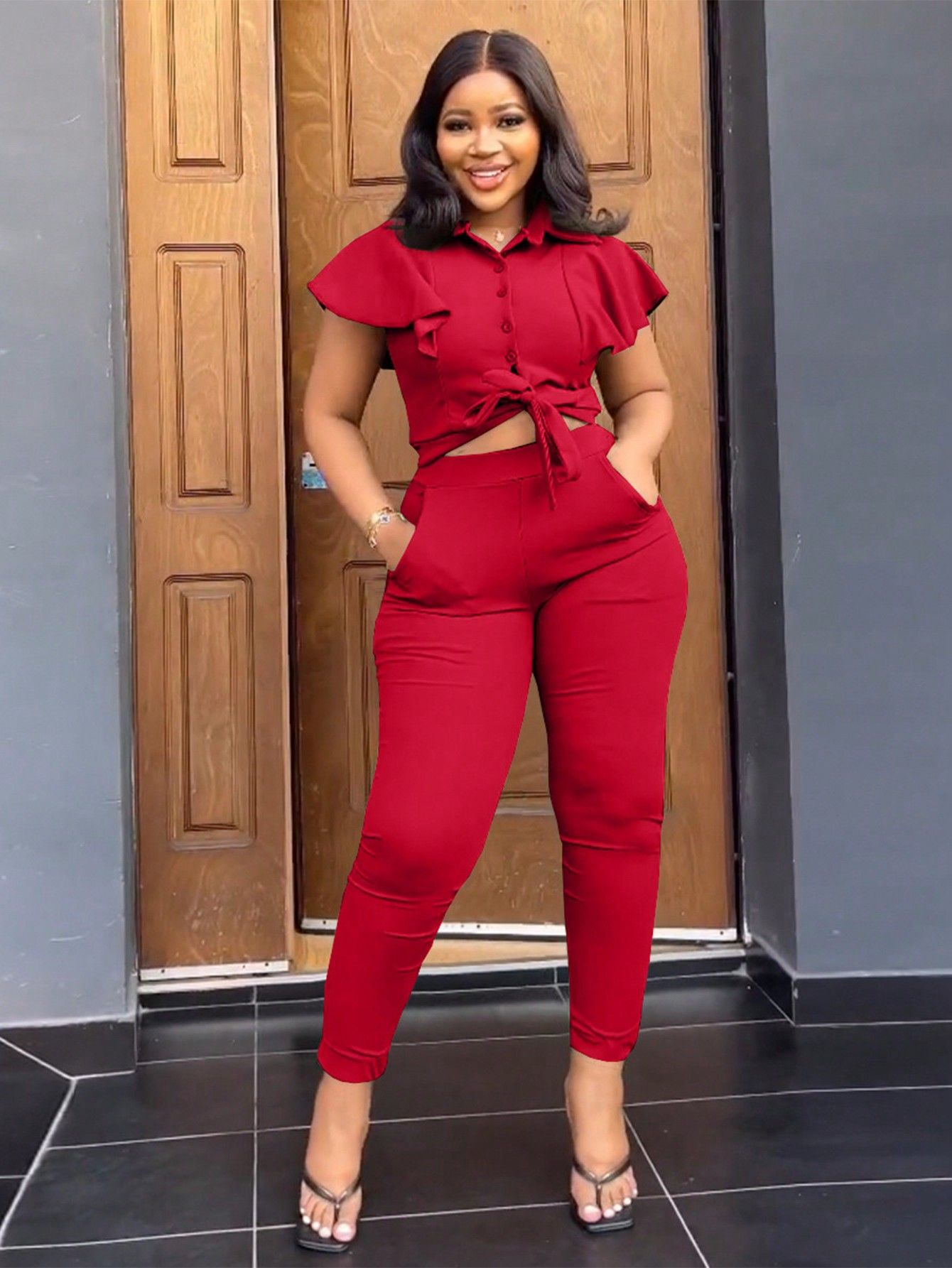 This Women's Two-Piece Ruffle Sleeve Lace-Up Shirt Waist Elastic Trousers Set Design Made Of High Quality polyester And Spandex Material. It Is Stretchy, Durable And Comfortable. It Is a Must-Have Outfit For All Seasons. retail Two Piece Pant Sets Can Solve Your cloth selection Troubles. Explore More 2 Piece Pants Set On BamBam retail Women Clothing Online Store.