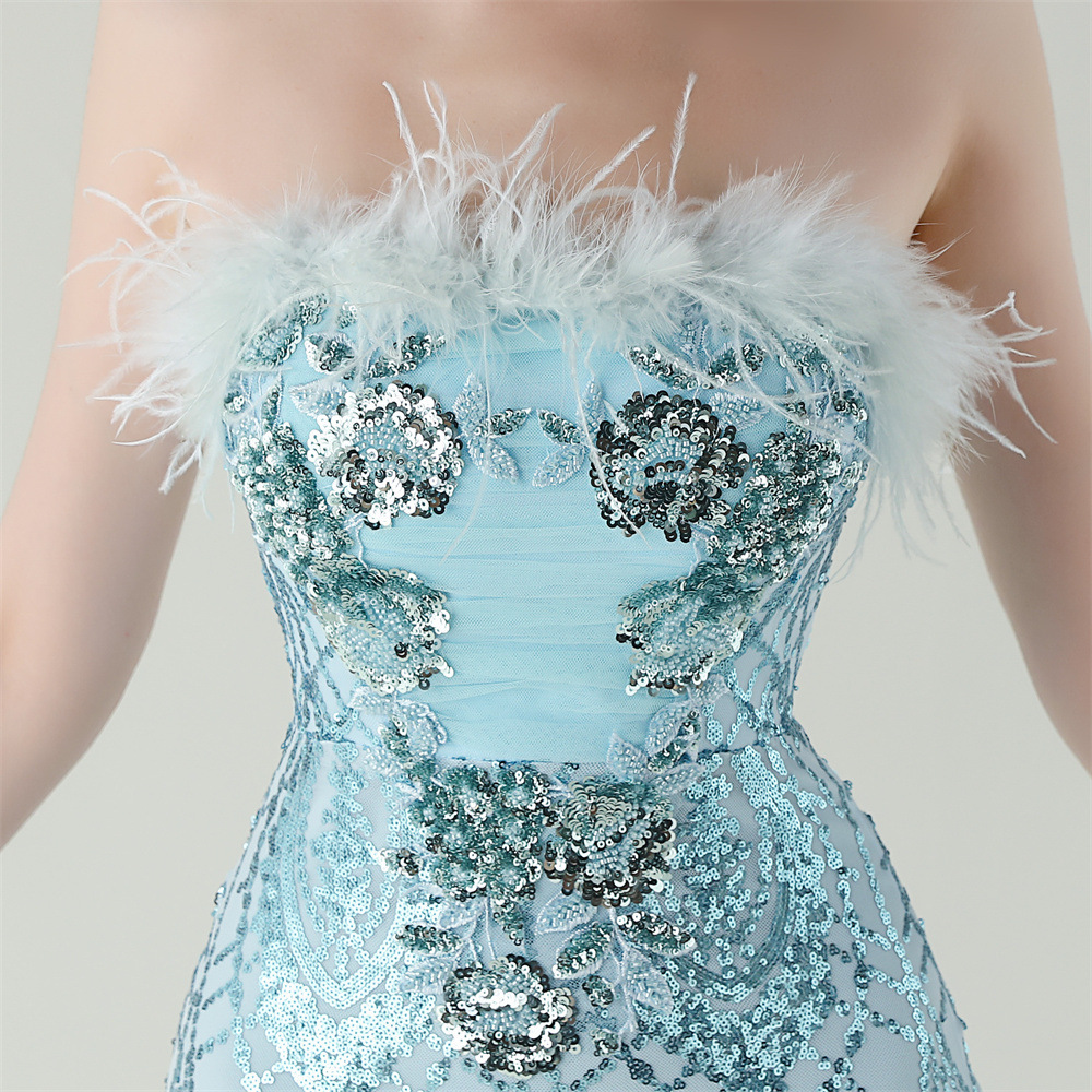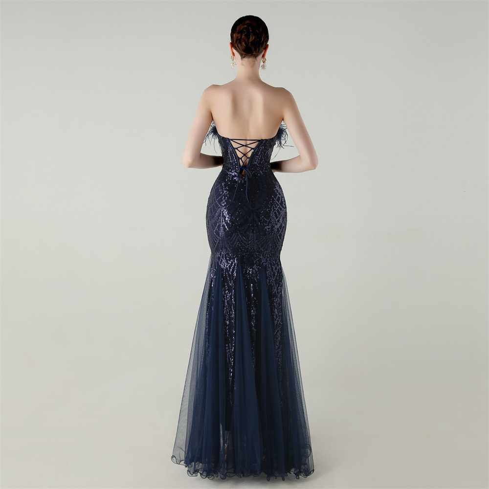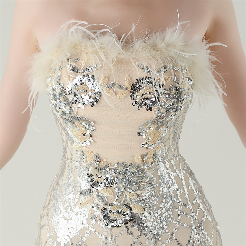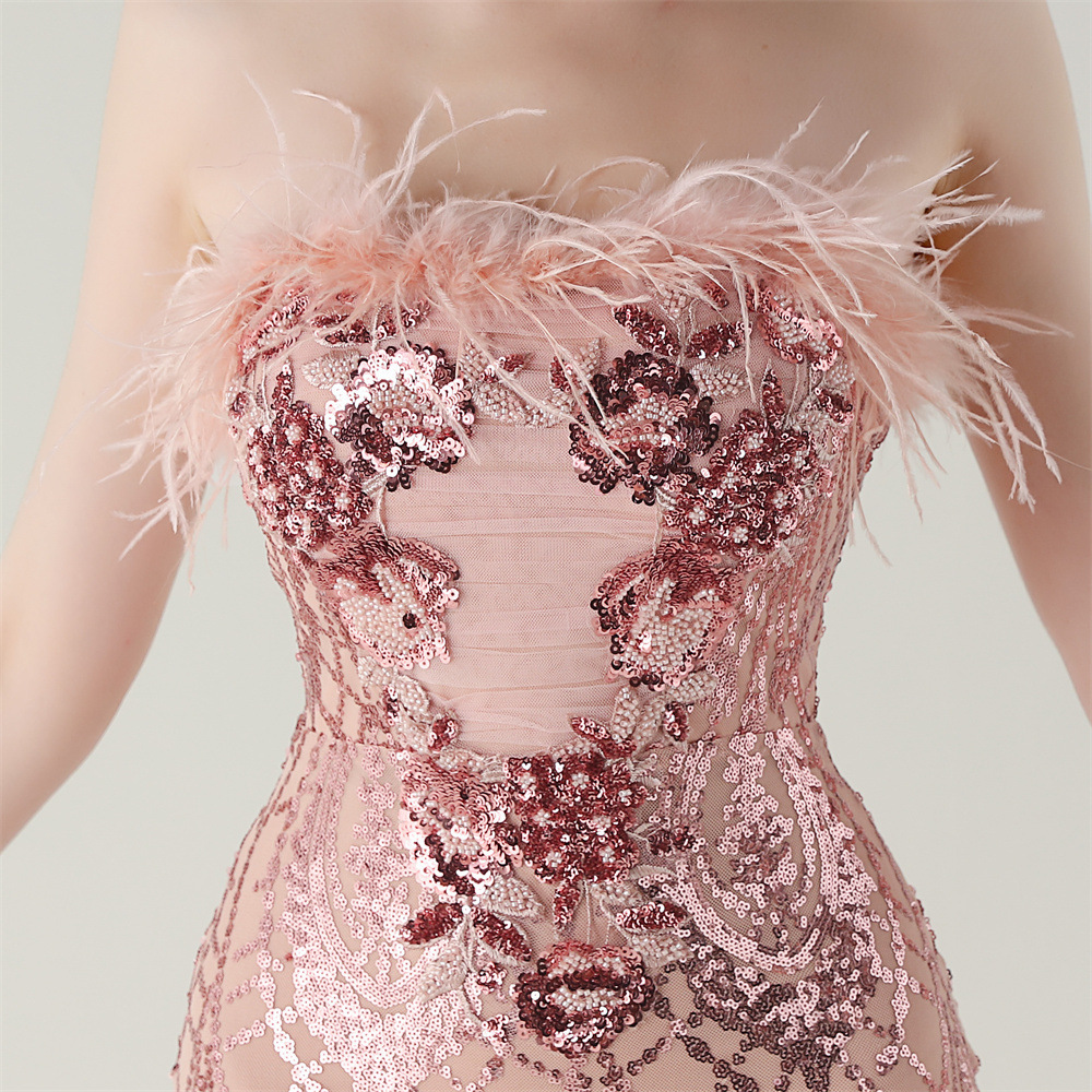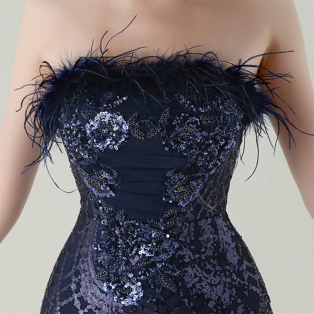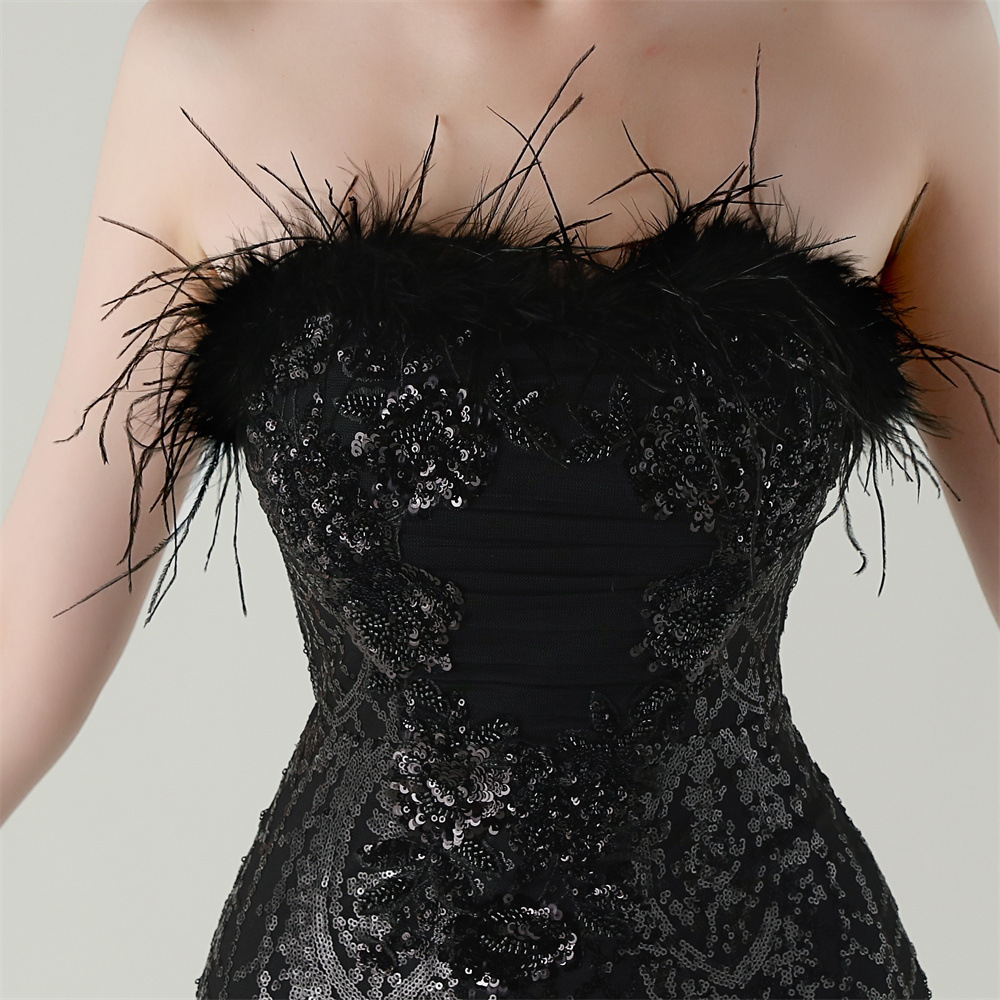 This Women Sequined Tube Flower Ostrich Feather Strapless Cross Lace-Up Mesh Formal Party Fishtail Evening Dress Design Made Of Good Quality Polyester And Spandex Material, Which Is Stretchy, Durable And Comfortable. The Long Evening Dresses And Gowns Is Always The main Choice For All Kinds Of Parties, Cocktail, Prom, Events, And Dating Occasions. Evening Gowns At BamBam Comes With Huge Selections - Sequins, Beaded, Satin, Velvet, Lace.... When You Need retail Evening Dresses, BamBam retail Women Garment Online Shop Is Your One-Stop Online Shopping Choice.