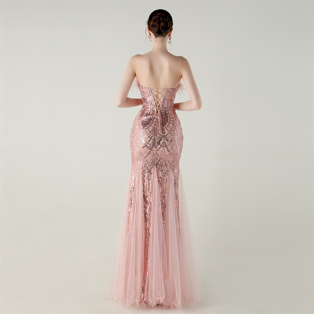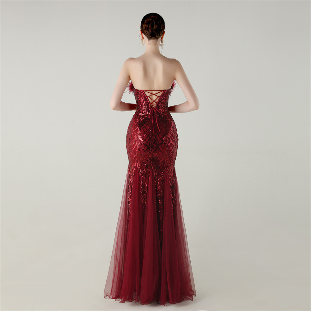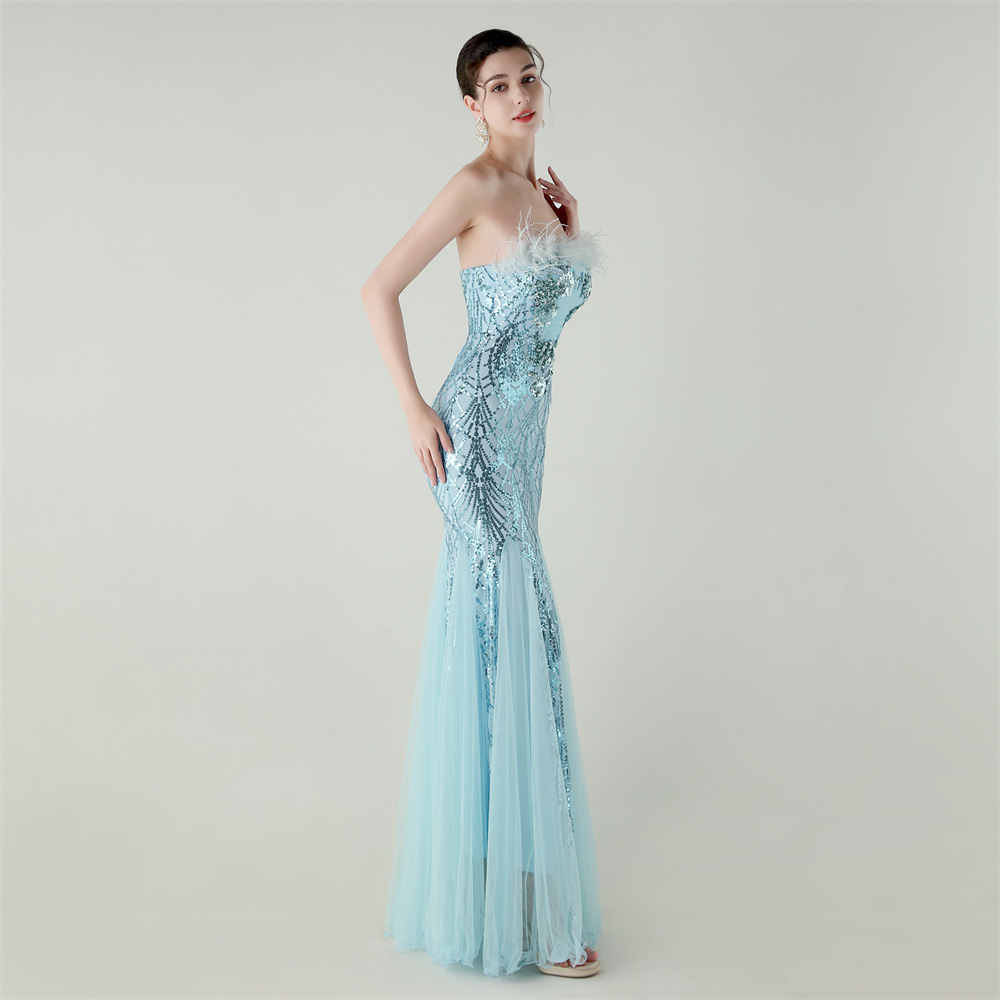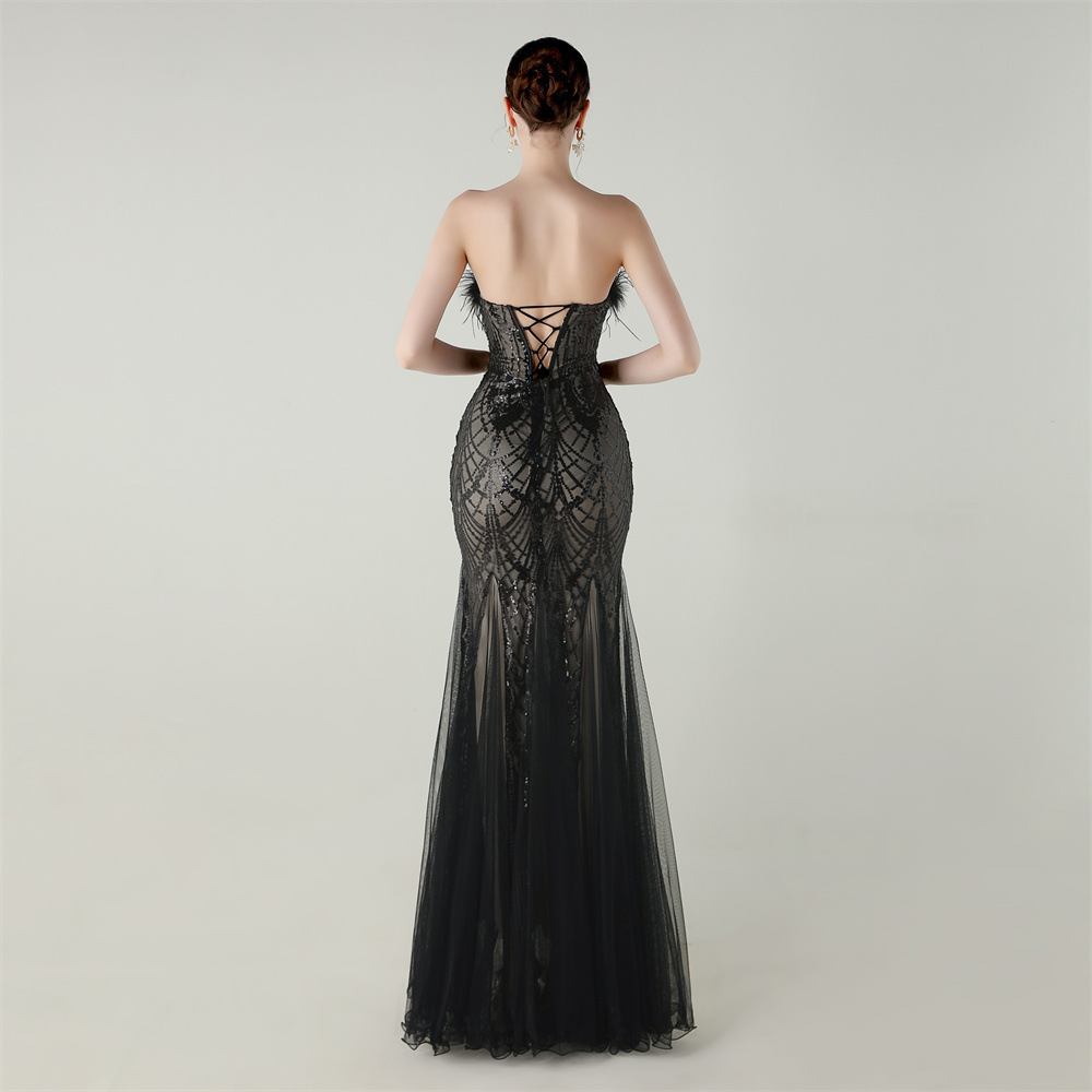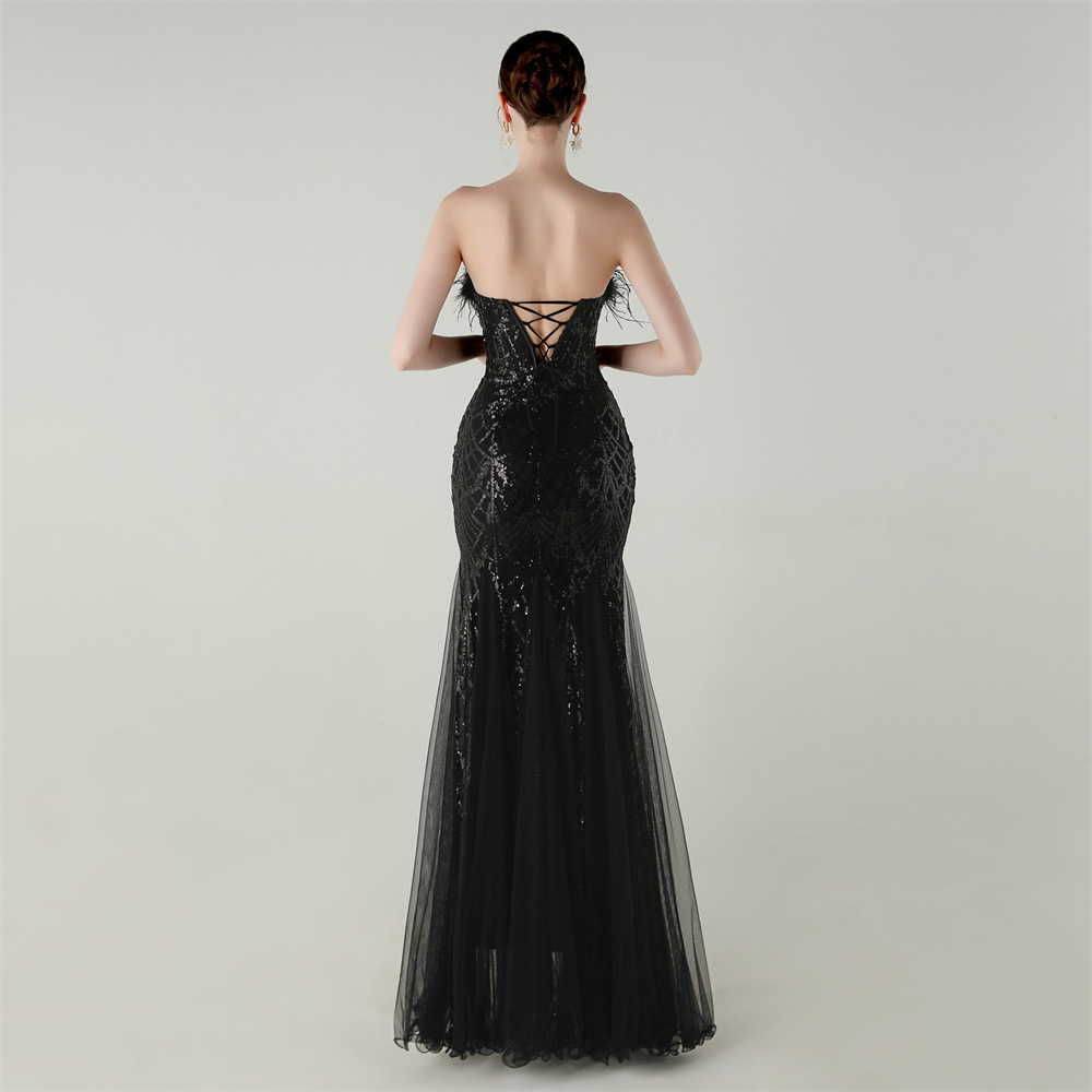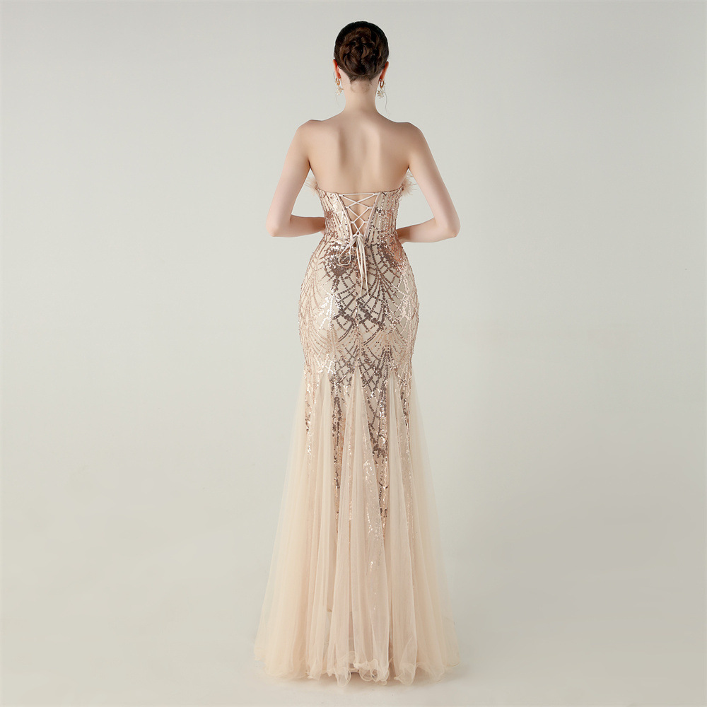 This Women Sequined Tube Flower Ostrich Feather Strapless Cross Lace-Up Mesh Formal Party Fishtail Evening Dress Design Made Of Good Quality Polyester And Spandex Material, Which Is Stretchy, Durable And Comfortable. The Long Evening Dresses And Gowns Is Always The main Choice For All Kinds Of Parties, Cocktail, Prom, Events, And Dating Occasions. Evening Gowns At BamBam Comes With Huge Selections - Sequins, Beaded, Satin, Velvet, Lace.... When You Need retail Evening Dresses, BamBam retail Women Garment Online Shop Is Your One-Stop Online Shopping Choice.