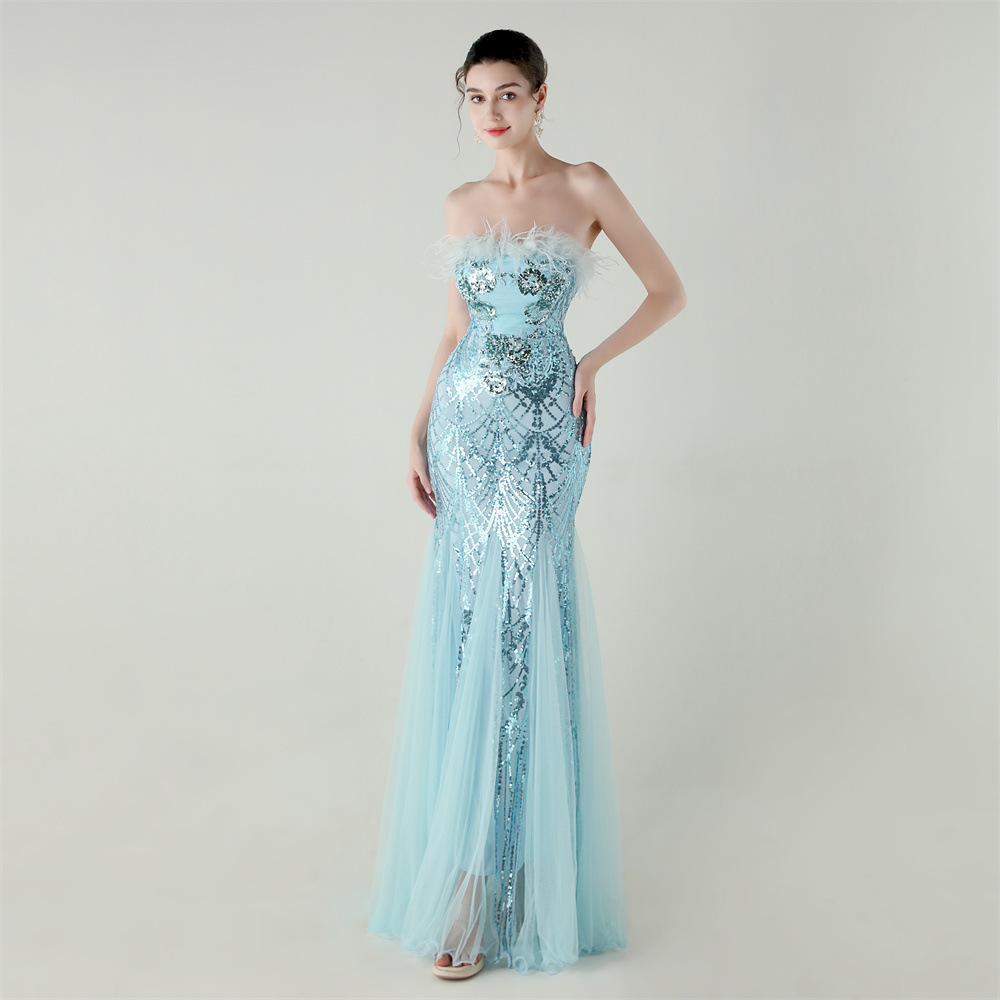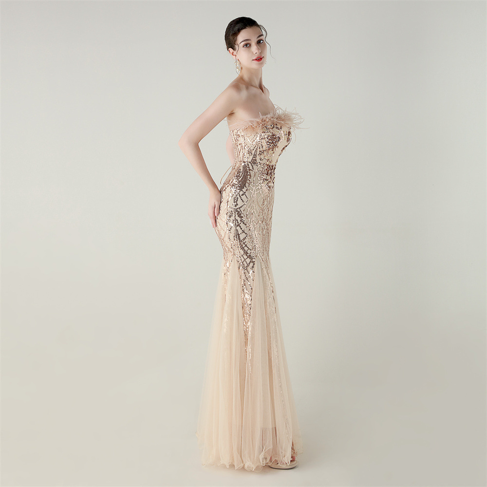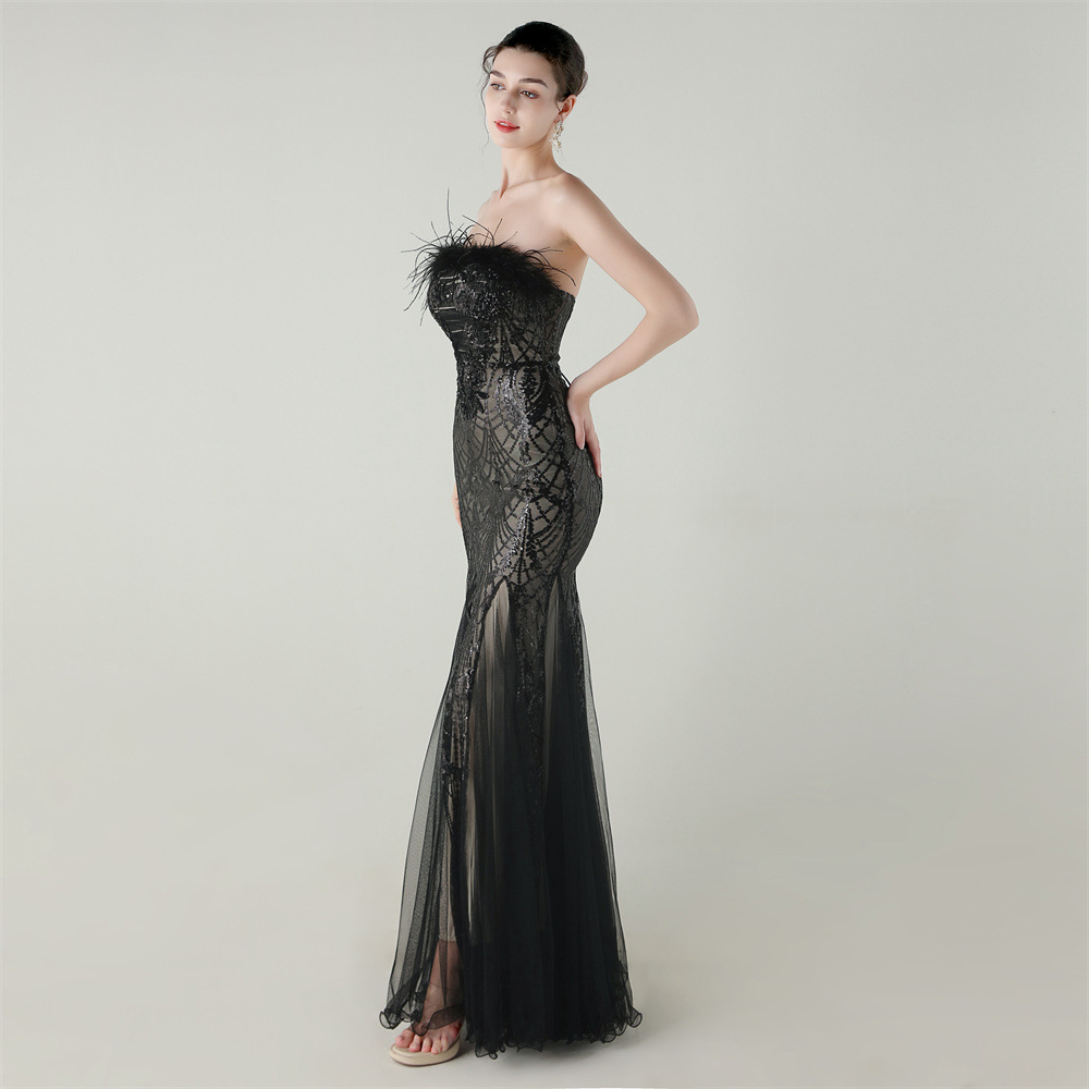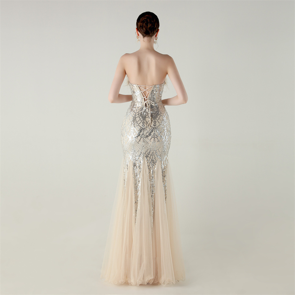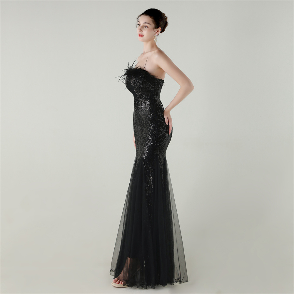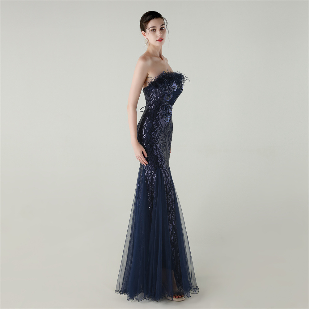 This Women Sequined Tube Flower Ostrich Feather Strapless Cross Lace-Up Mesh Formal Party Fishtail Evening Dress Design Made Of Good Quality Polyester And Spandex Material, Which Is Stretchy, Durable And Comfortable. The Long Evening Dresses And Gowns Is Always The main Choice For All Kinds Of Parties, Cocktail, Prom, Events, And Dating Occasions. Evening Gowns At BamBam Comes With Huge Selections - Sequins, Beaded, Satin, Velvet, Lace.... When You Need retail Evening Dresses, BamBam retail Women Garment Online Shop Is Your One-Stop Online Shopping Choice.