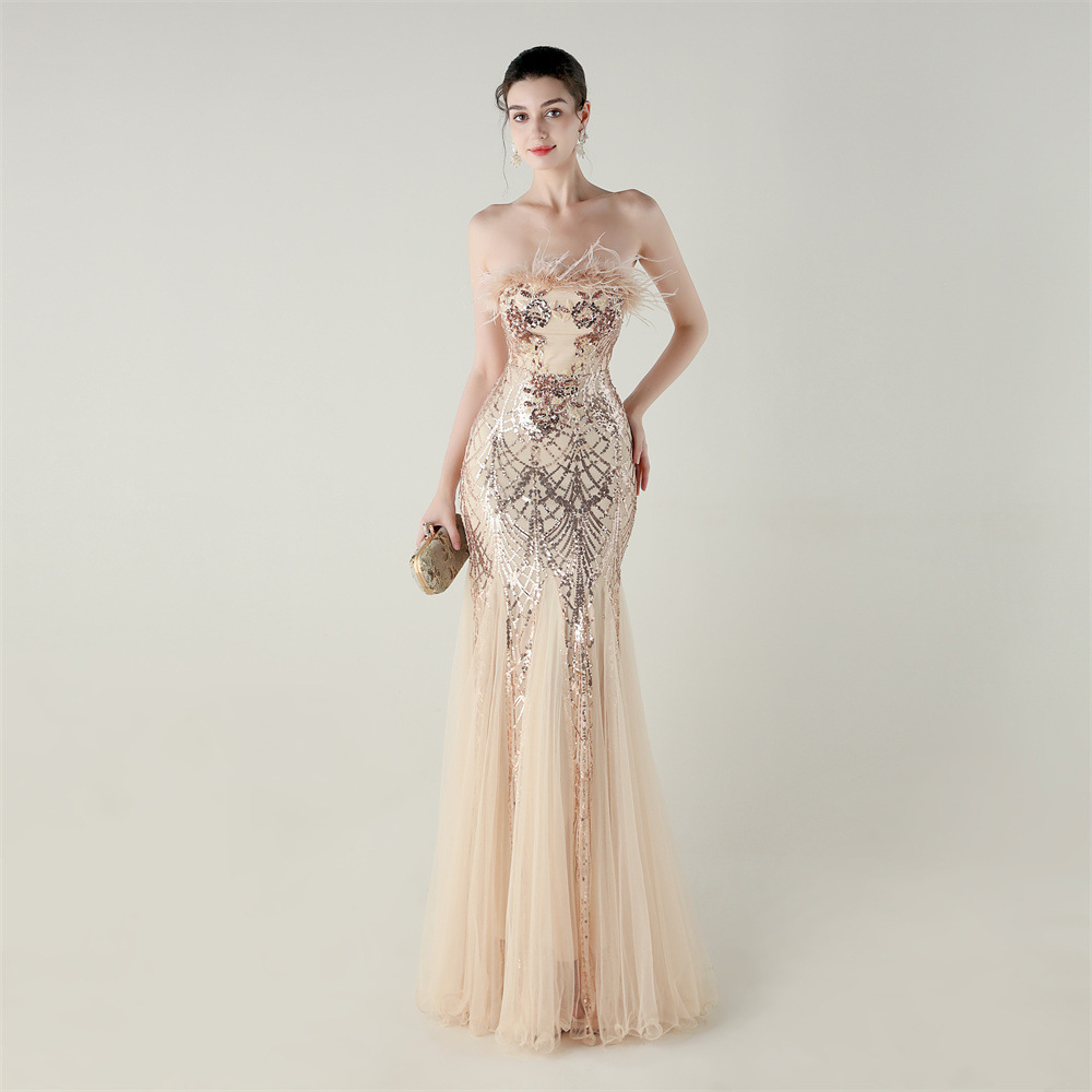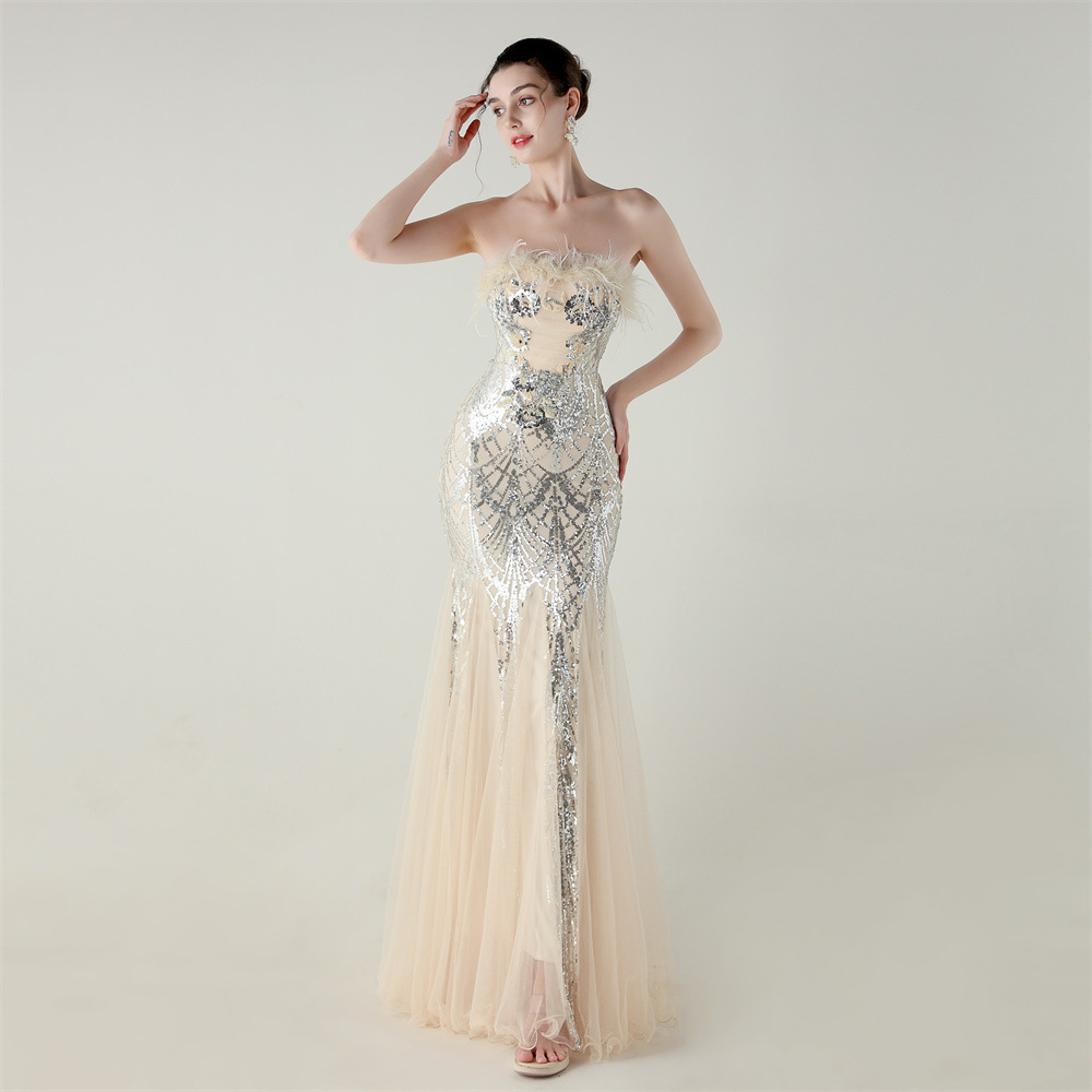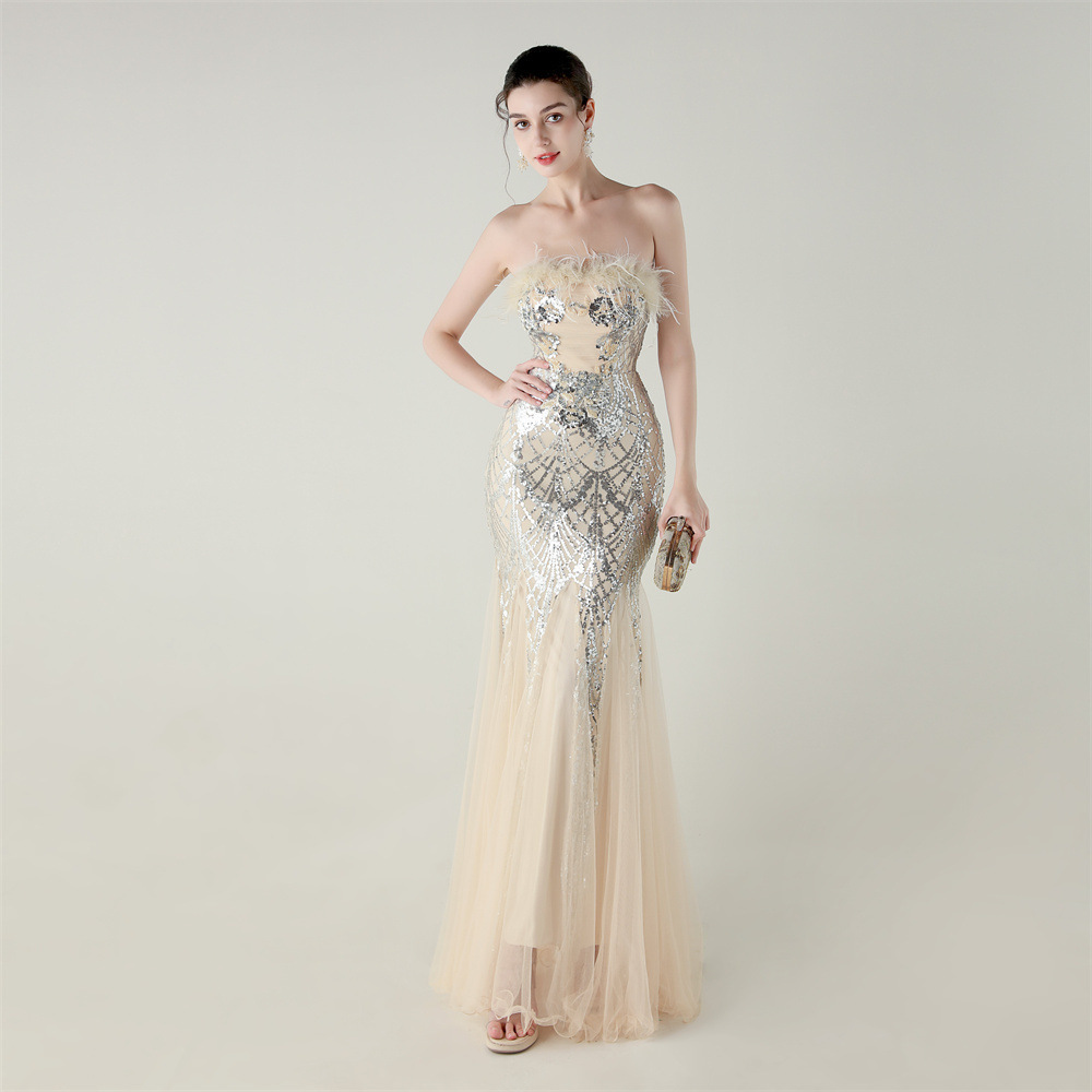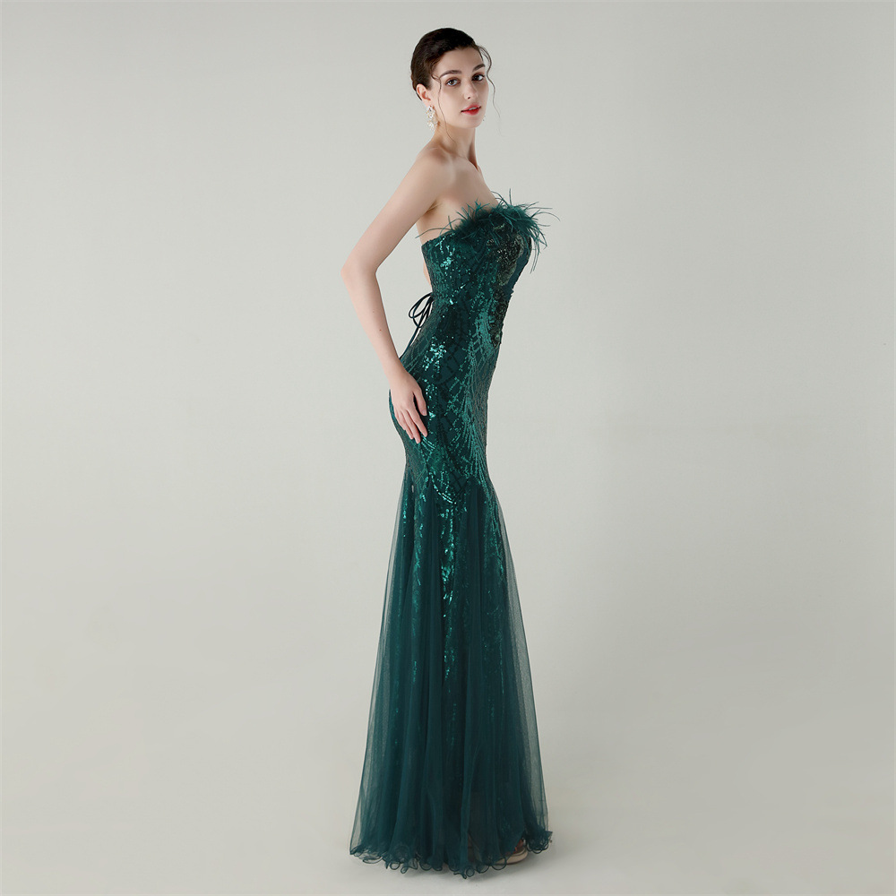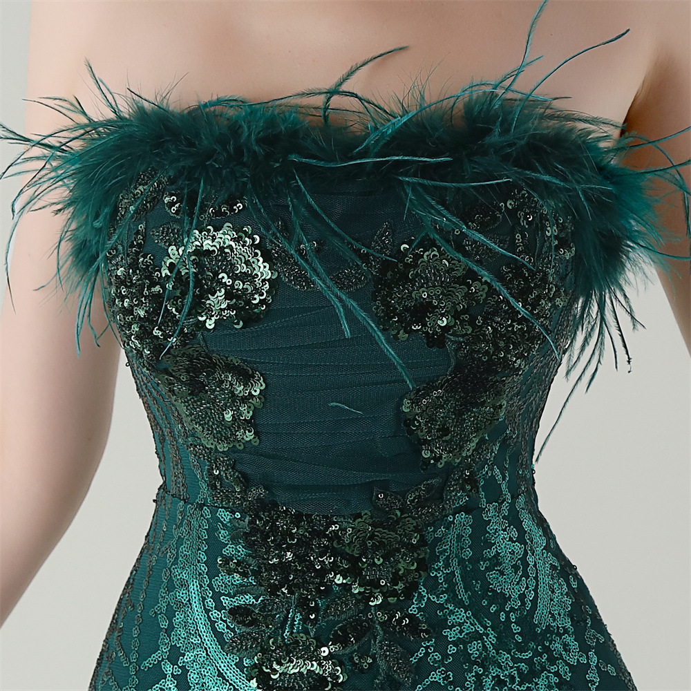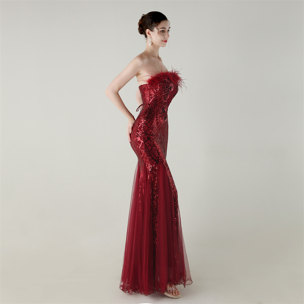 This Women Sequined Tube Flower Ostrich Feather Strapless Cross Lace-Up Mesh Formal Party Fishtail Evening Dress Design Made Of Good Quality Polyester And Spandex Material, Which Is Stretchy, Durable And Comfortable. The Long Evening Dresses And Gowns Is Always The main Choice For All Kinds Of Parties, Cocktail, Prom, Events, And Dating Occasions. Evening Gowns At BamBam Comes With Huge Selections - Sequins, Beaded, Satin, Velvet, Lace.... When You Need retail Evening Dresses, BamBam retail Women Garment Online Shop Is Your One-Stop Online Shopping Choice.