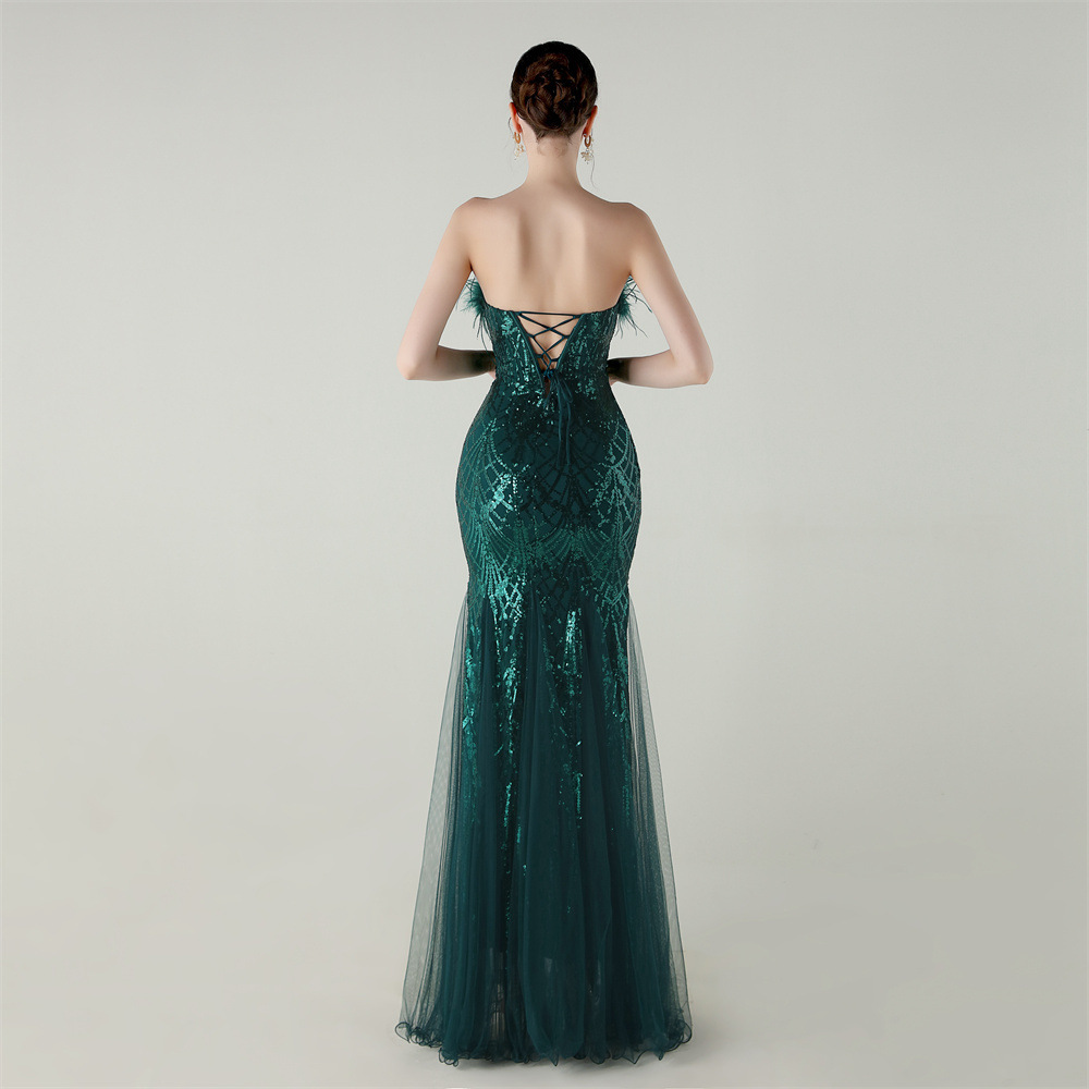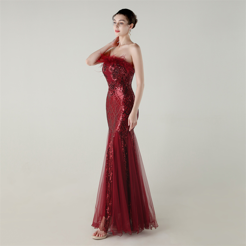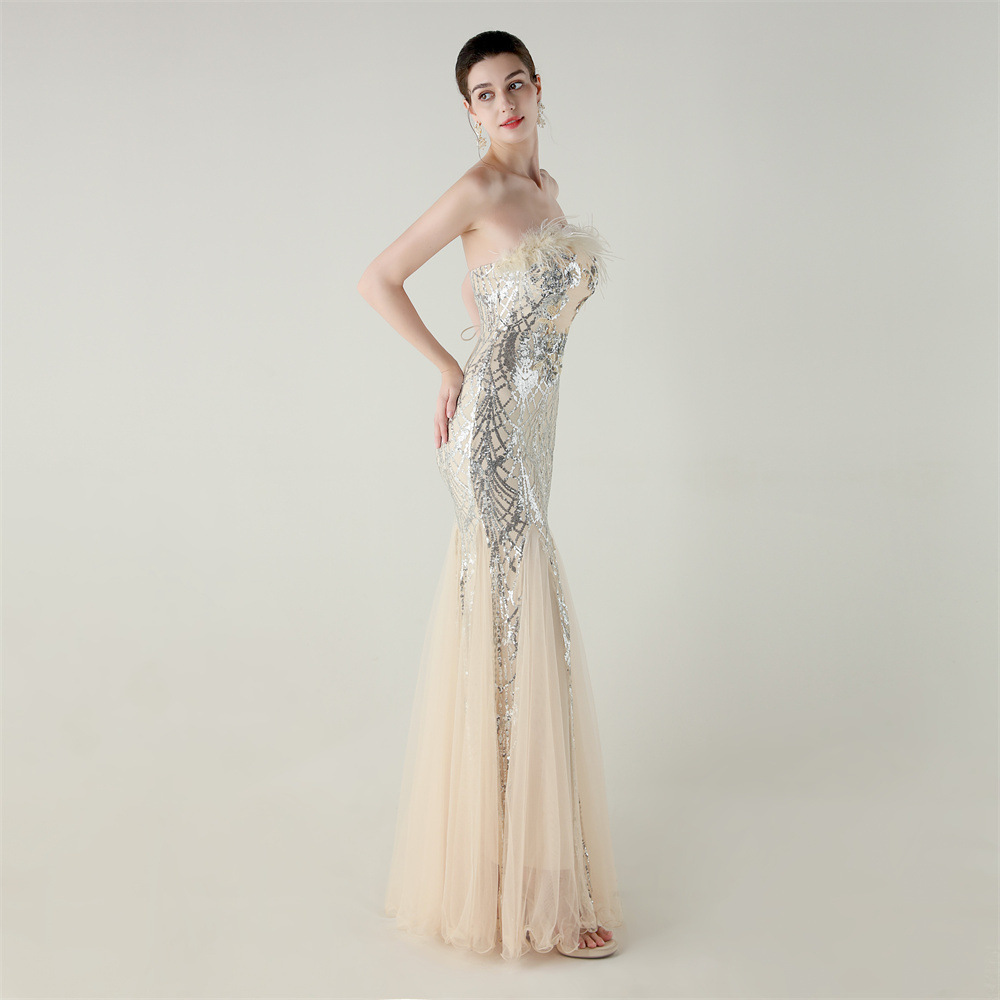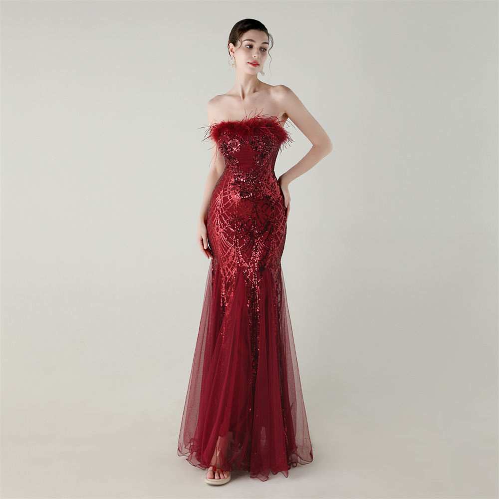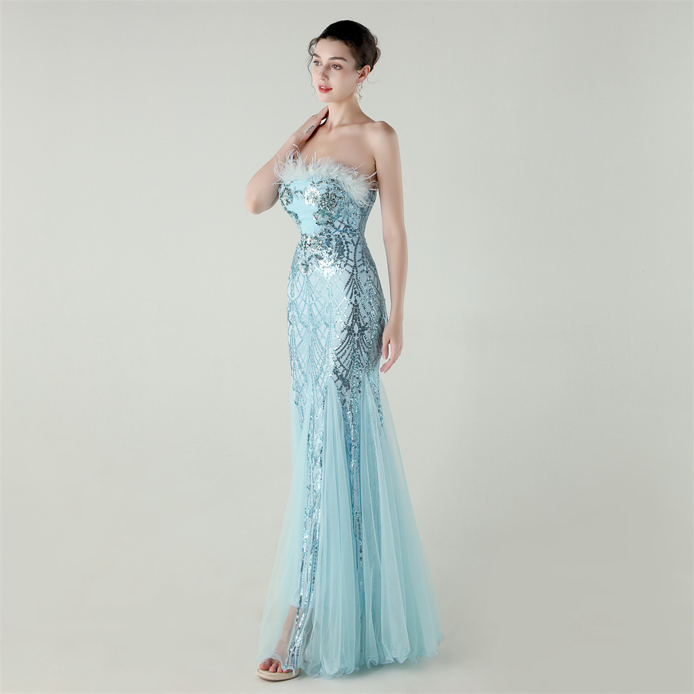This Women Sequined Tube Flower Ostrich Feather Strapless Cross Lace-Up Mesh Formal Party Fishtail Evening Dress Design Made Of Good Quality Polyester And Spandex Material, Which Is Stretchy, Durable And Comfortable. The Long Evening Dresses And Gowns Is Always The main Choice For All Kinds Of Parties, Cocktail, Prom, Events, And Dating Occasions. Evening Gowns At BamBam Comes With Huge Selections - Sequins, Beaded, Satin, Velvet, Lace.... When You Need retail Evening Dresses, BamBam retail Women Garment Online Shop Is Your One-Stop Online Shopping Choice.