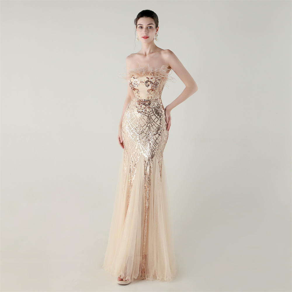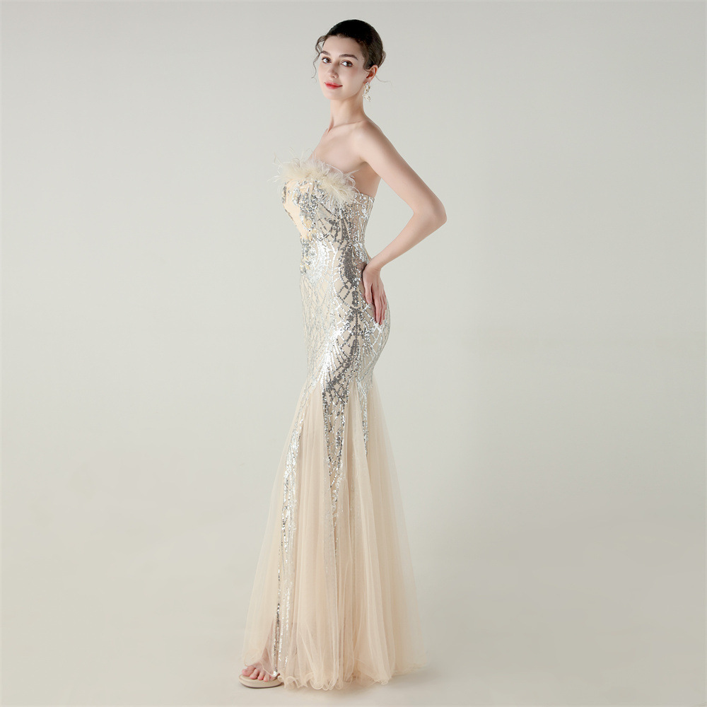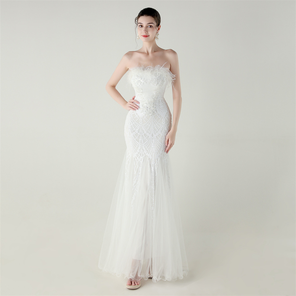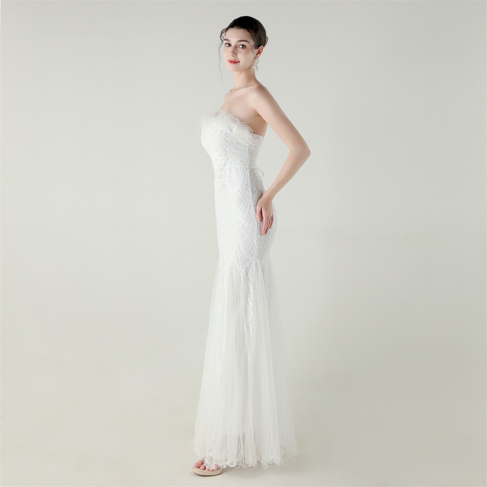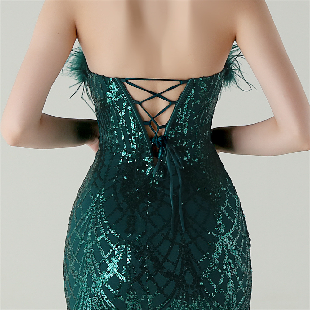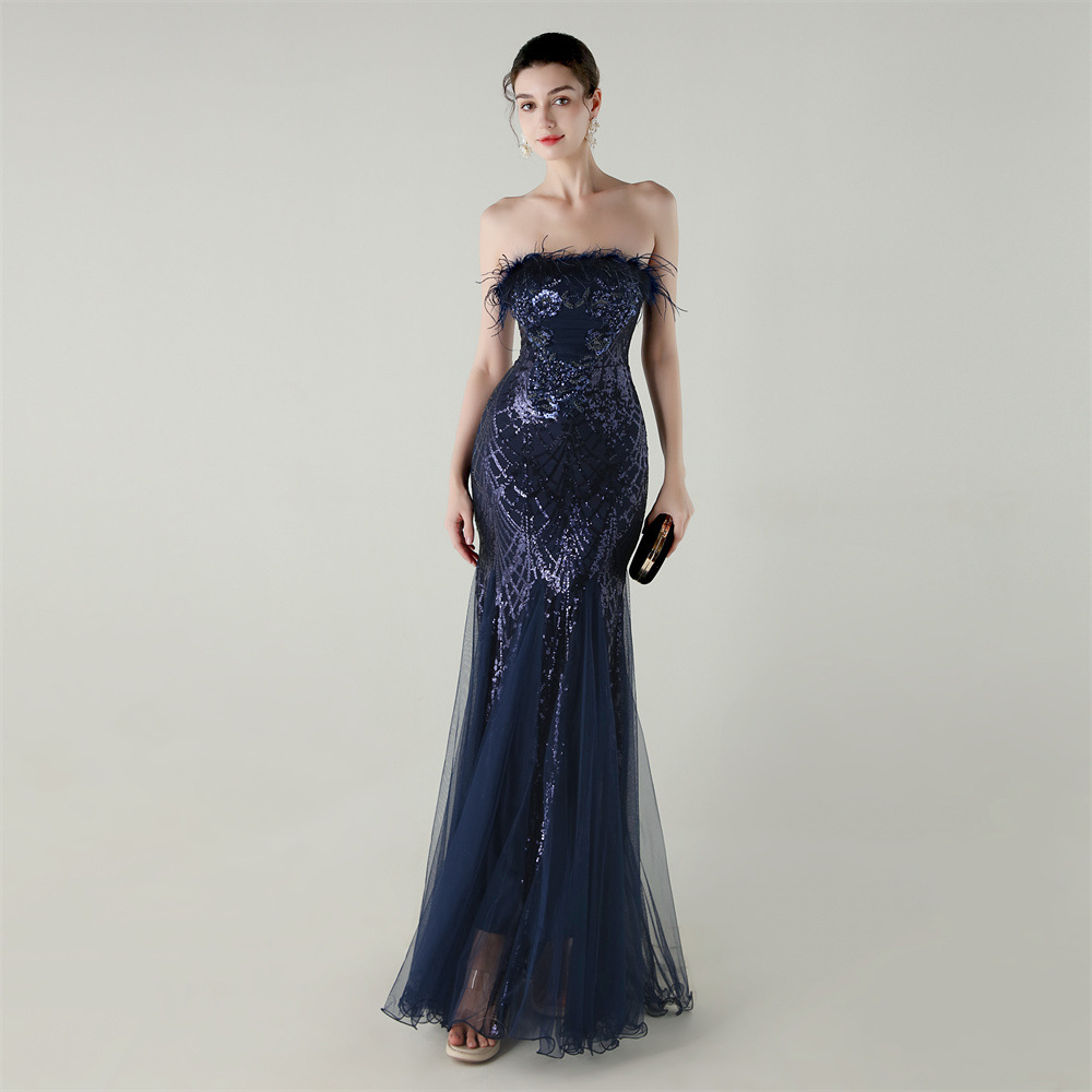 This Women Sequined Tube Flower Ostrich Feather Strapless Cross Lace-Up Mesh Formal Party Fishtail Evening Dress Design Made Of Good Quality Polyester And Spandex Material, Which Is Stretchy, Durable And Comfortable. The Long Evening Dresses And Gowns Is Always The main Choice For All Kinds Of Parties, Cocktail, Prom, Events, And Dating Occasions. Evening Gowns At BamBam Comes With Huge Selections - Sequins, Beaded, Satin, Velvet, Lace.... When You Need retail Evening Dresses, BamBam retail Women Garment Online Shop Is Your One-Stop Online Shopping Choice.