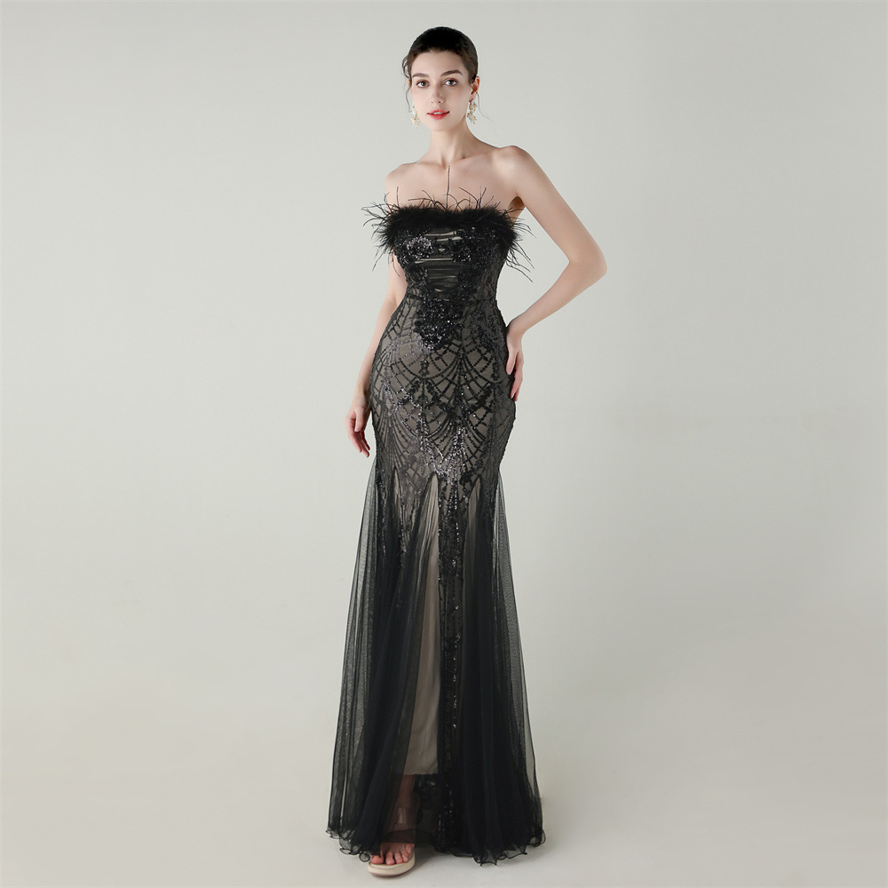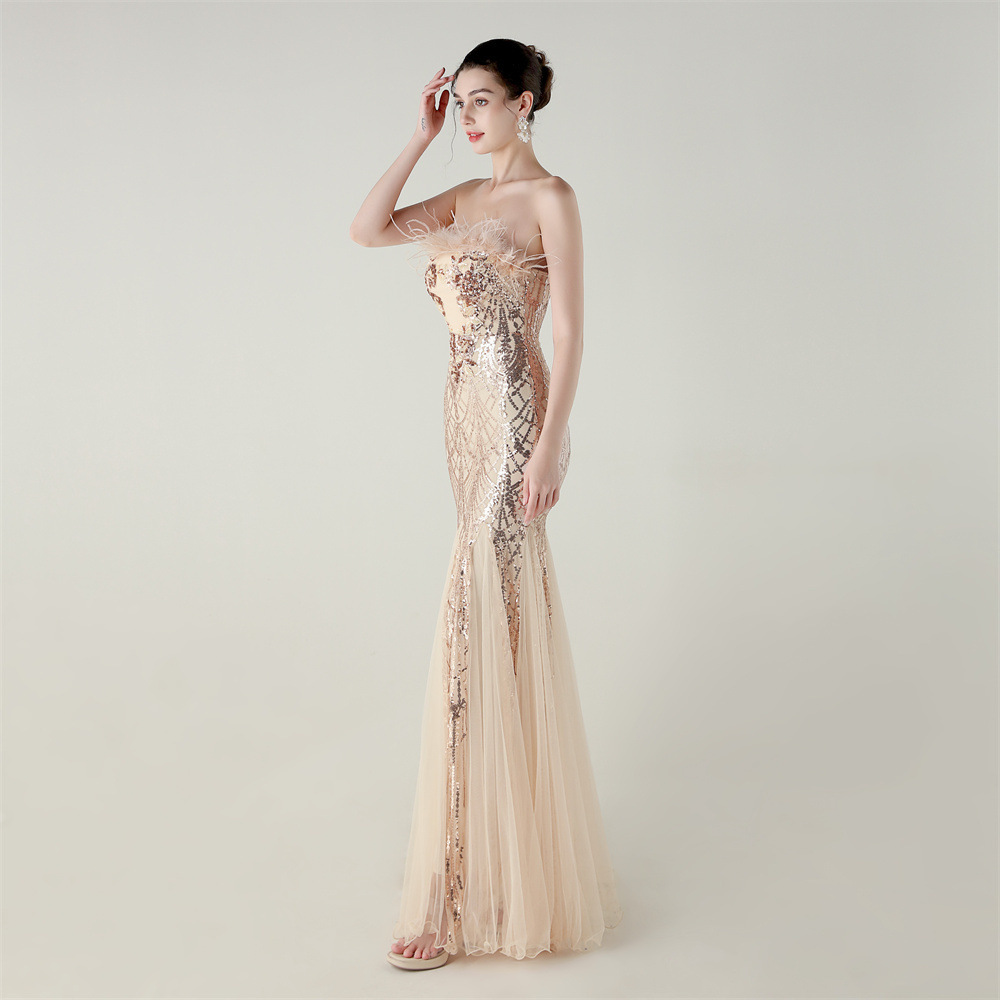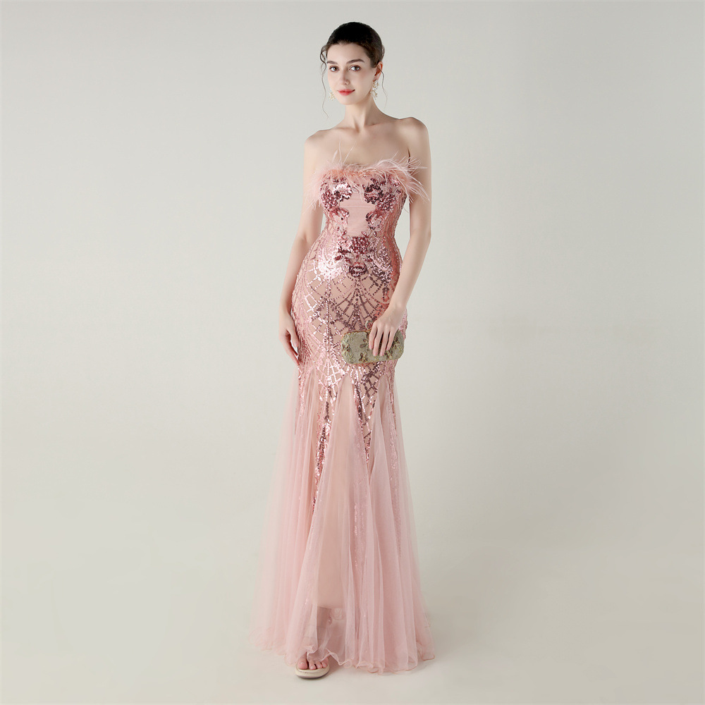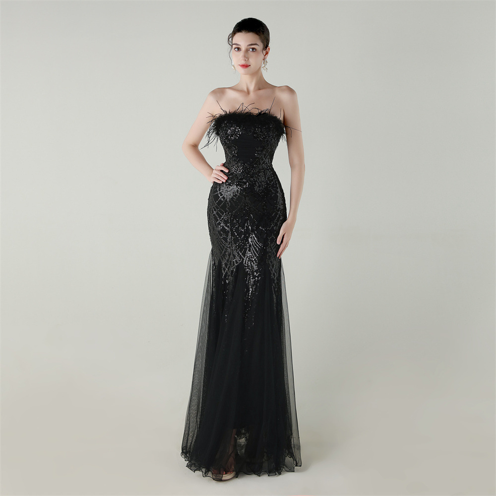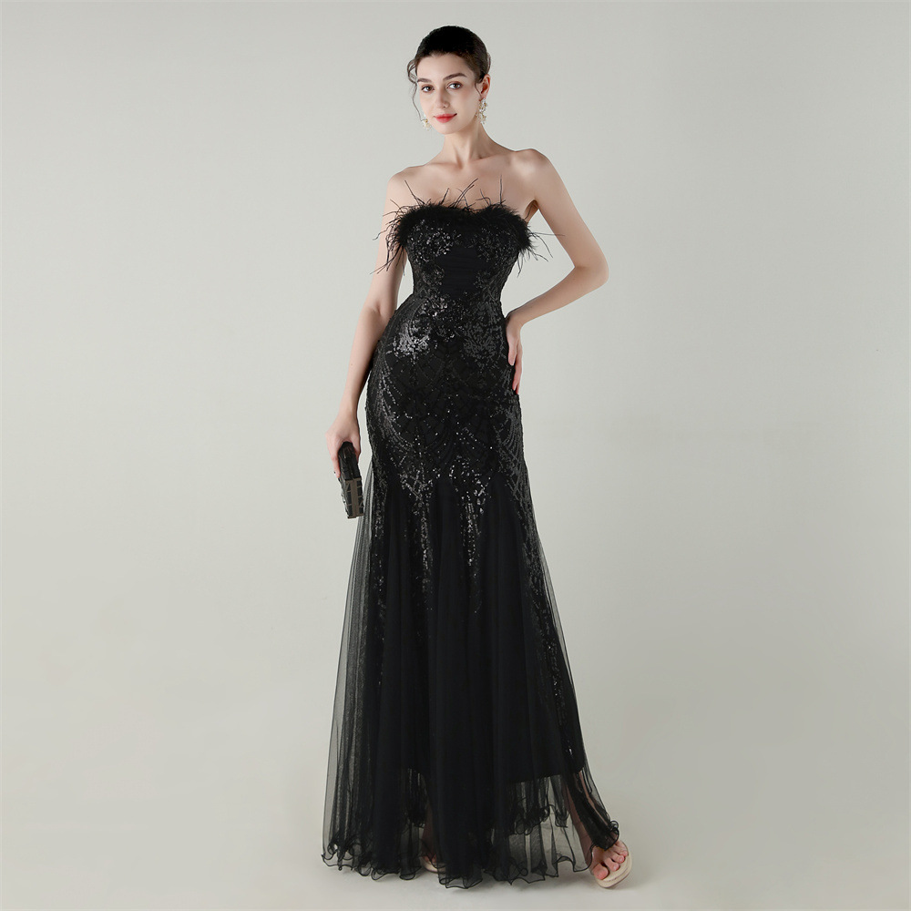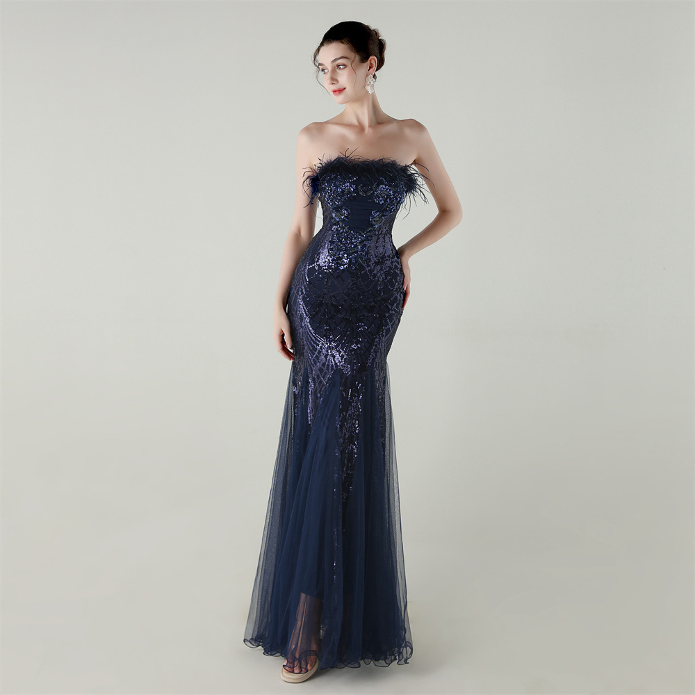 This Women Sequined Tube Flower Ostrich Feather Strapless Cross Lace-Up Mesh Formal Party Fishtail Evening Dress Design Made Of Good Quality Polyester And Spandex Material, Which Is Stretchy, Durable And Comfortable. The Long Evening Dresses And Gowns Is Always The main Choice For All Kinds Of Parties, Cocktail, Prom, Events, And Dating Occasions. Evening Gowns At BamBam Comes With Huge Selections - Sequins, Beaded, Satin, Velvet, Lace.... When You Need retail Evening Dresses, BamBam retail Women Garment Online Shop Is Your One-Stop Online Shopping Choice.