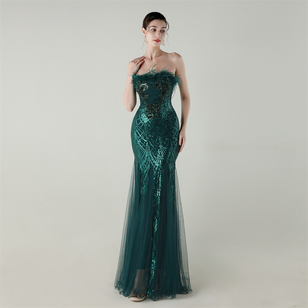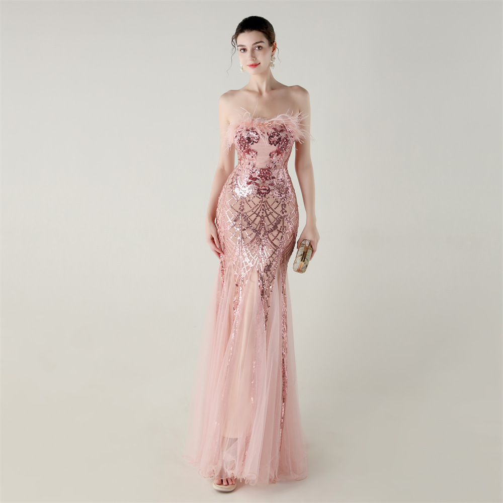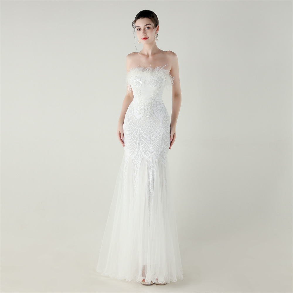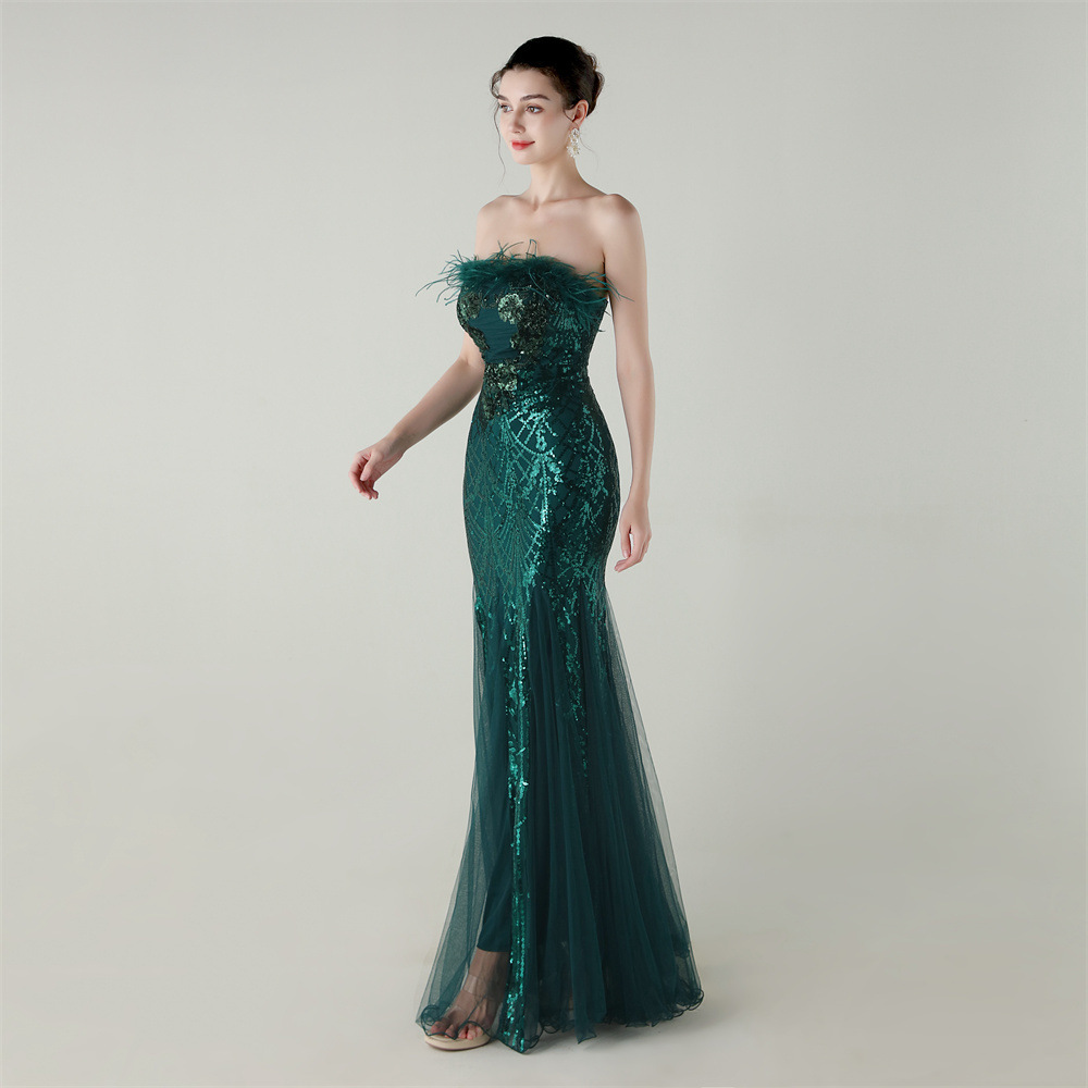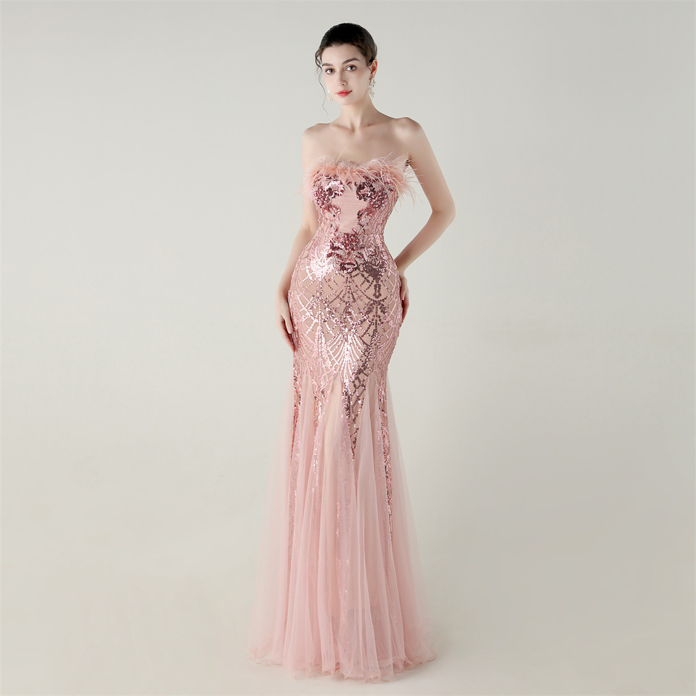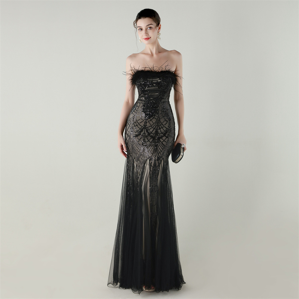 This Women Sequined Tube Flower Ostrich Feather Strapless Cross Lace-Up Mesh Formal Party Fishtail Evening Dress Design Made Of Good Quality Polyester And Spandex Material, Which Is Stretchy, Durable And Comfortable. The Long Evening Dresses And Gowns Is Always The main Choice For All Kinds Of Parties, Cocktail, Prom, Events, And Dating Occasions. Evening Gowns At BamBam Comes With Huge Selections - Sequins, Beaded, Satin, Velvet, Lace.... When You Need retail Evening Dresses, BamBam retail Women Garment Online Shop Is Your One-Stop Online Shopping Choice.