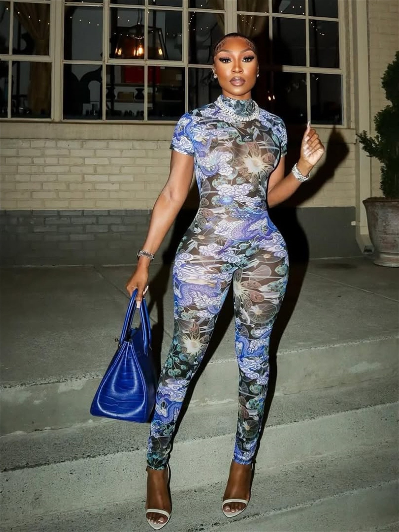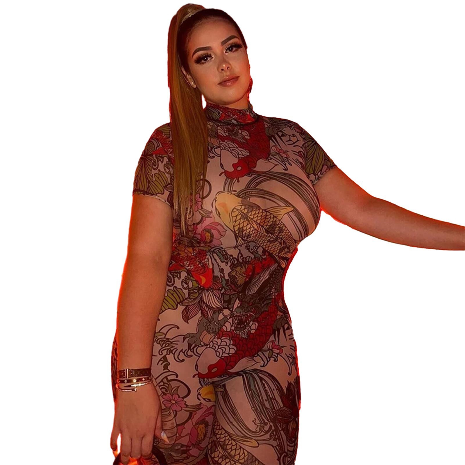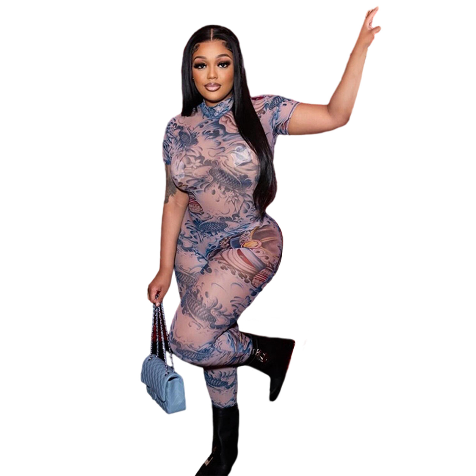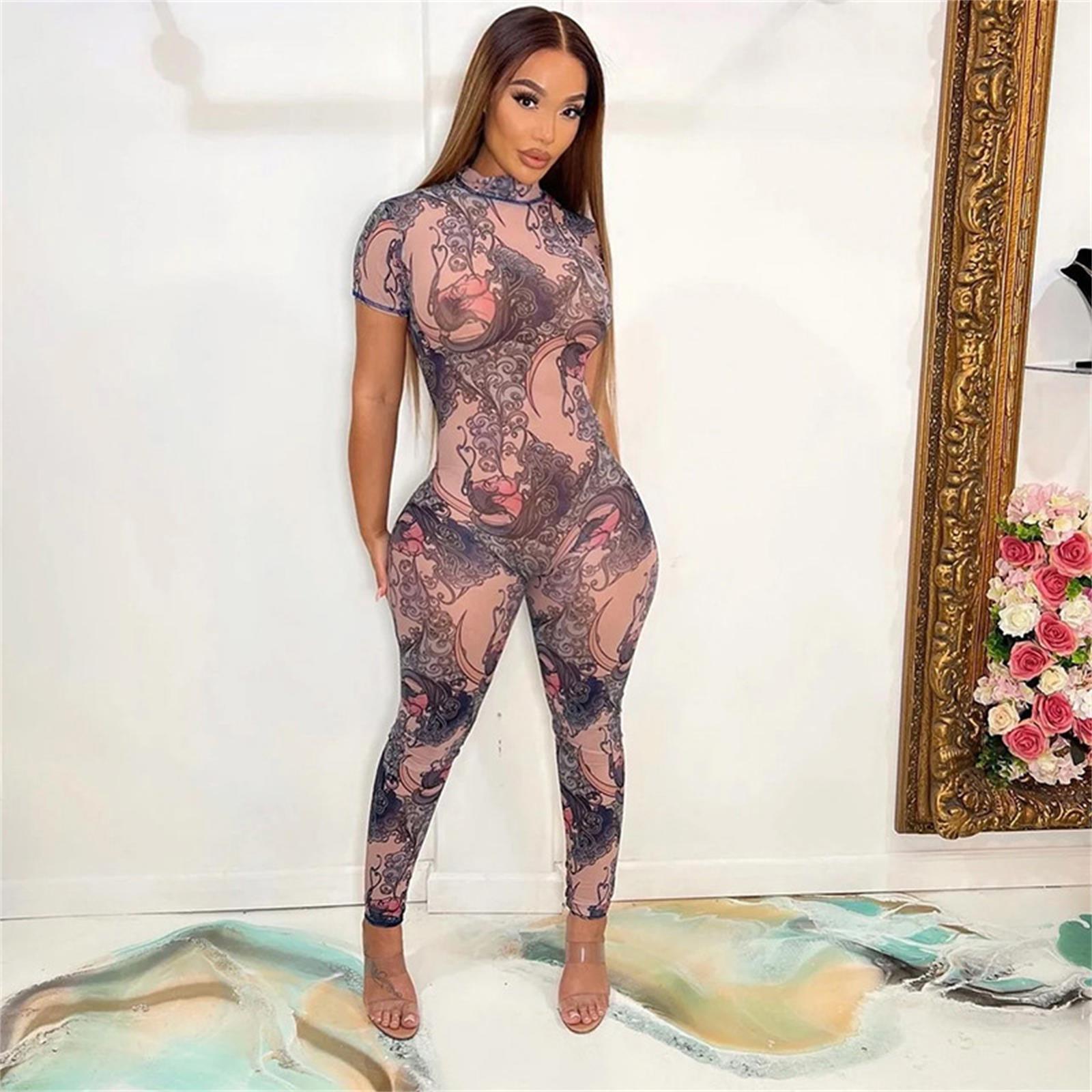 This Women Sexy Backless Print See-Through Mesh Jumpsuit Design Made Of High Quality Polyster And Spandex Material. It Is Stretchy, Durable And Comfortable. Affordable Sexy Jumpsuits For Women Has Long Been a Party Favorite. BamBam provides a Rich selection Of Sequin, Beaded, See Through Mesh, Leopard, Floral Lace, Leather, Velvet, Tight And Fitted retail Jumpsuit Without Moq Limit.