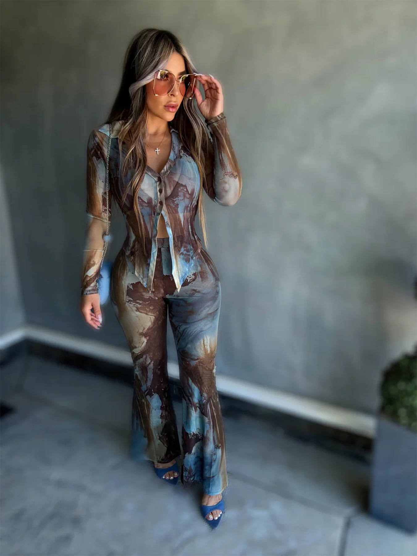 This Women Sexy Button Printed Mesh Top And Bell Bottom Pants Two-Piece Set Design Made Of High Quality polyester And Spandex Material. It Is Stretchy, Durable And Comfortable. It Is a Must-Have Outfit For All Seasons. retail Two Piece Pant Sets Can Solve Your cloth selection Troubles. Explore More 2 Piece Pants Set On BamBam retail Women Clothing Online Store.