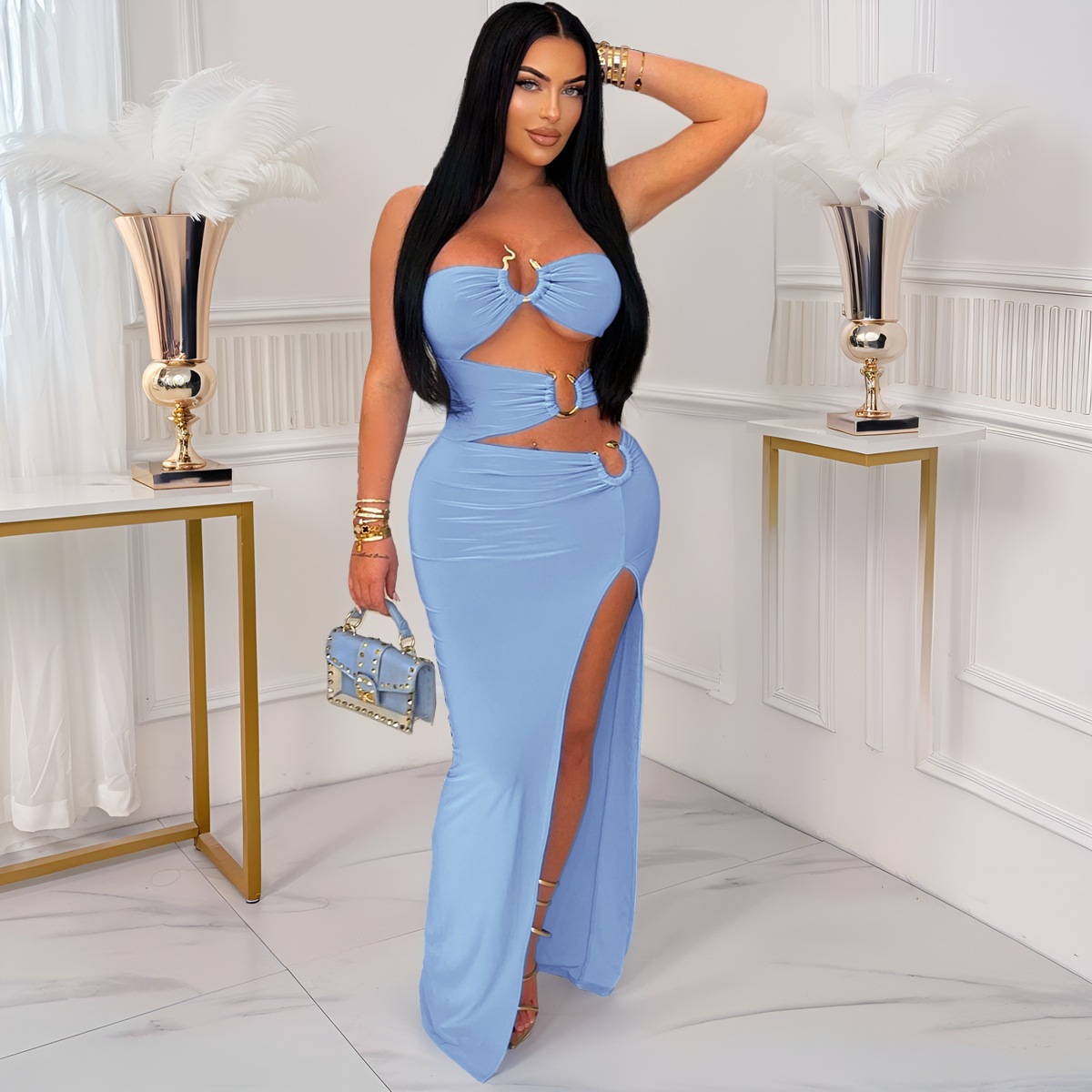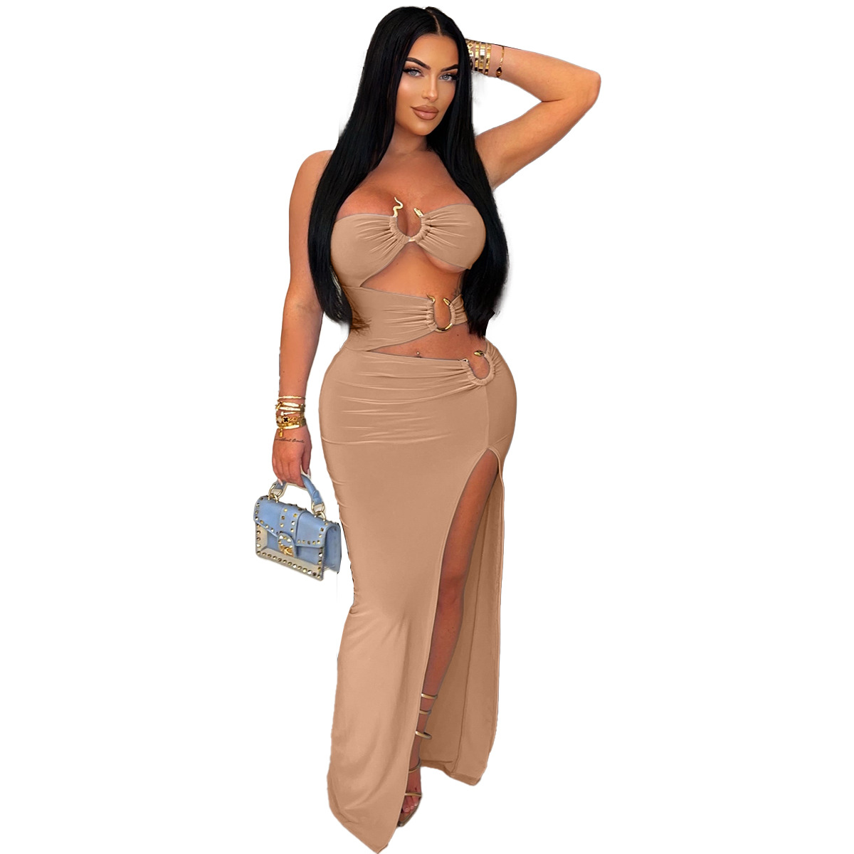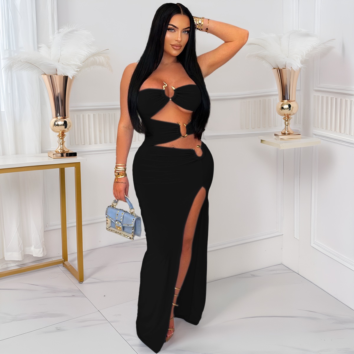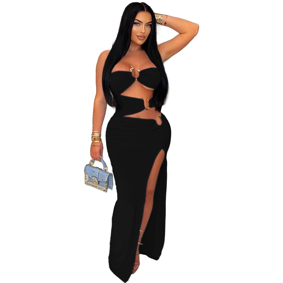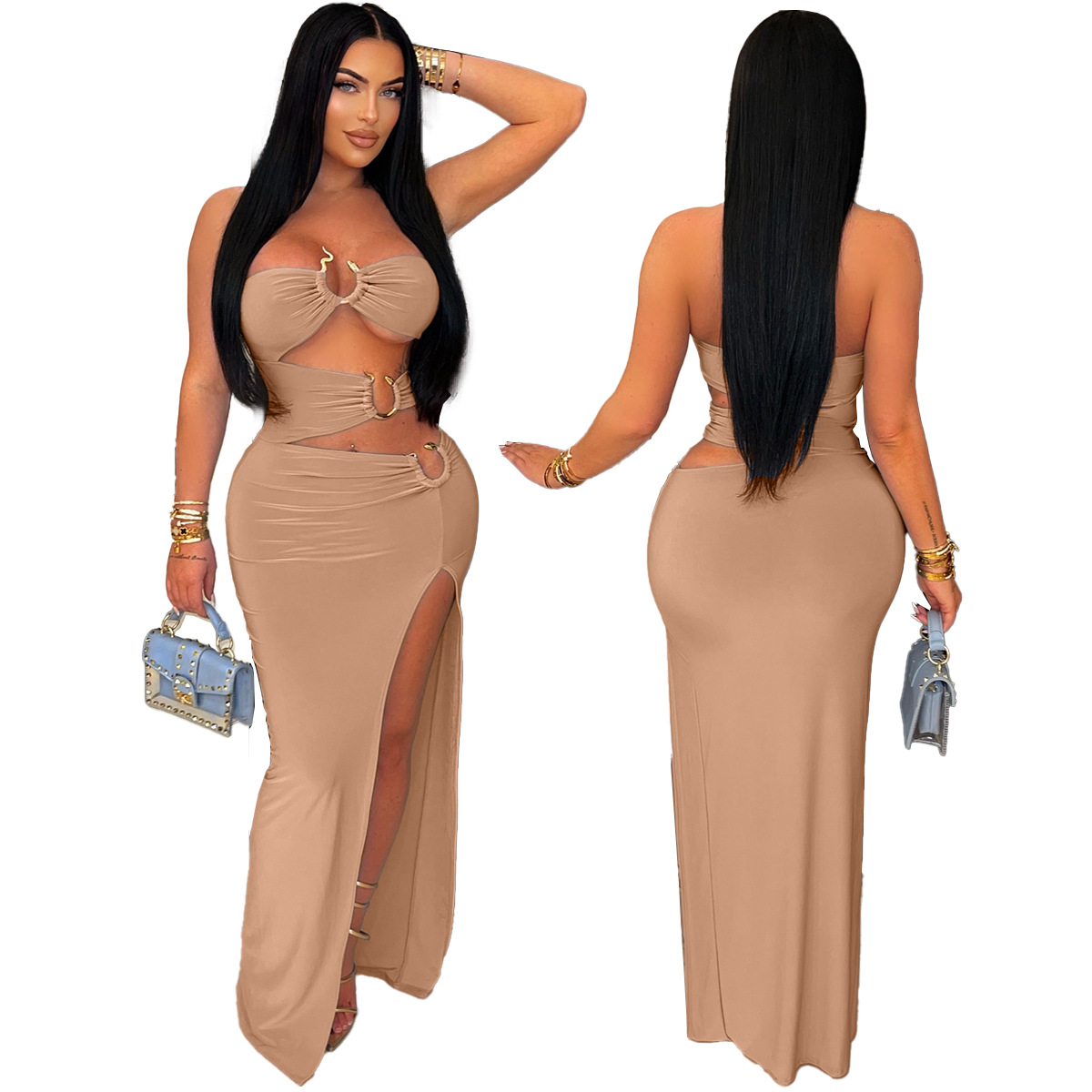 This Women Sexy Cutout Metallic Patchwork Slit Bodycon Maxi Dress Design Made Of Good Quality Polyester And Spandex Material, Which Is Stretchy, Durable And Comfortable. The Long Evening Dresses And Gowns Is Always The main Choice For All Kinds Of Parties, Cocktail, Prom, Events, And Dating Occasions. Evening Gowns At BamBam Comes With Huge Selections - Sequins, Beaded, Satin, Velvet, Lace.... When You Need retail Evening Dresses, BamBam retail Women Garment Online Shop Is Your One-Stop Online Shopping Choice.