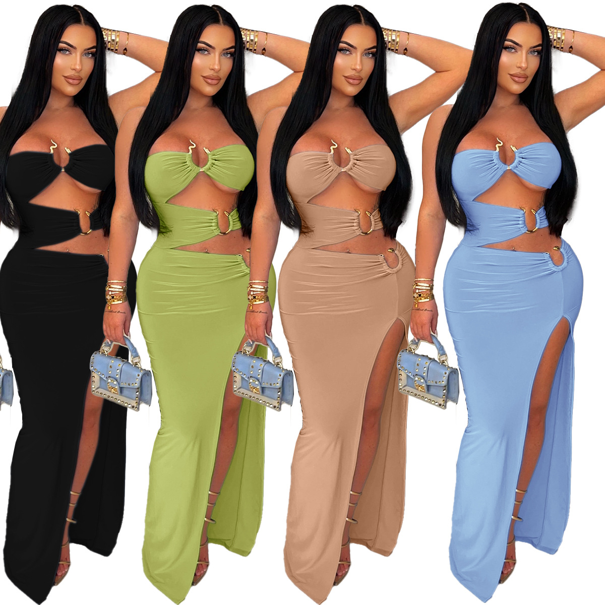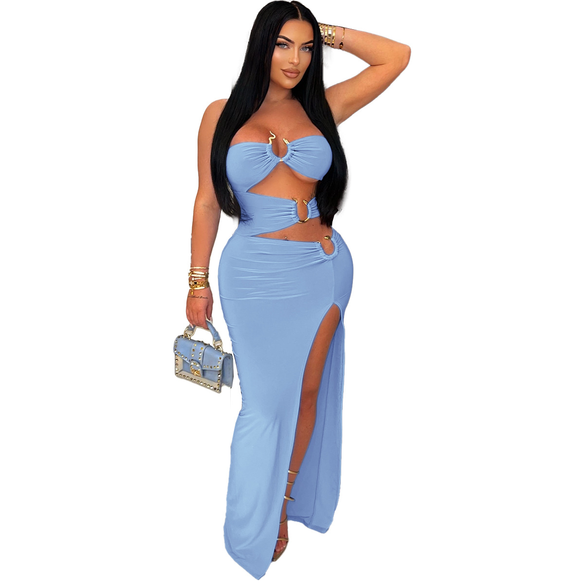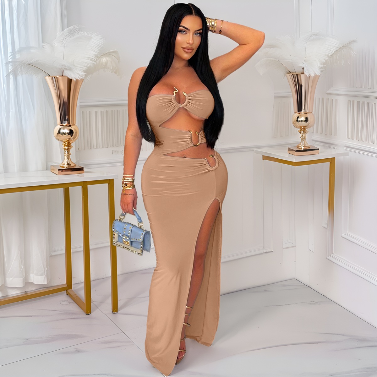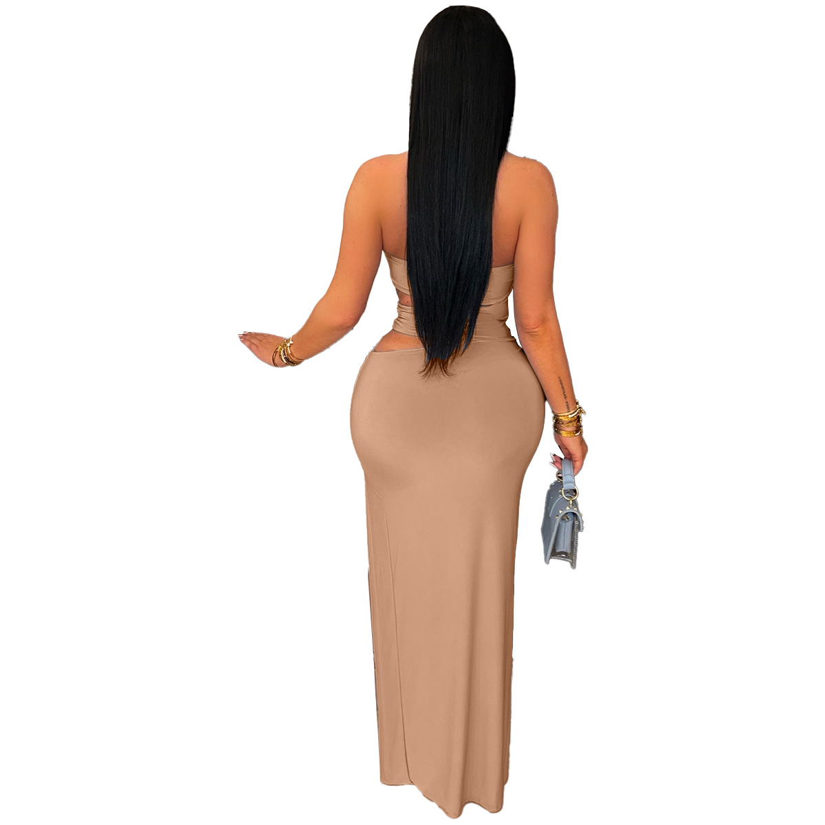 This Women Sexy Cutout Metallic Patchwork Slit Bodycon Maxi Dress Design Made Of Good Quality Polyester And Spandex Material, Which Is Stretchy, Durable And Comfortable. The Long Evening Dresses And Gowns Is Always The main Choice For All Kinds Of Parties, Cocktail, Prom, Events, And Dating Occasions. Evening Gowns At BamBam Comes With Huge Selections - Sequins, Beaded, Satin, Velvet, Lace.... When You Need retail Evening Dresses, BamBam retail Women Garment Online Shop Is Your One-Stop Online Shopping Choice.