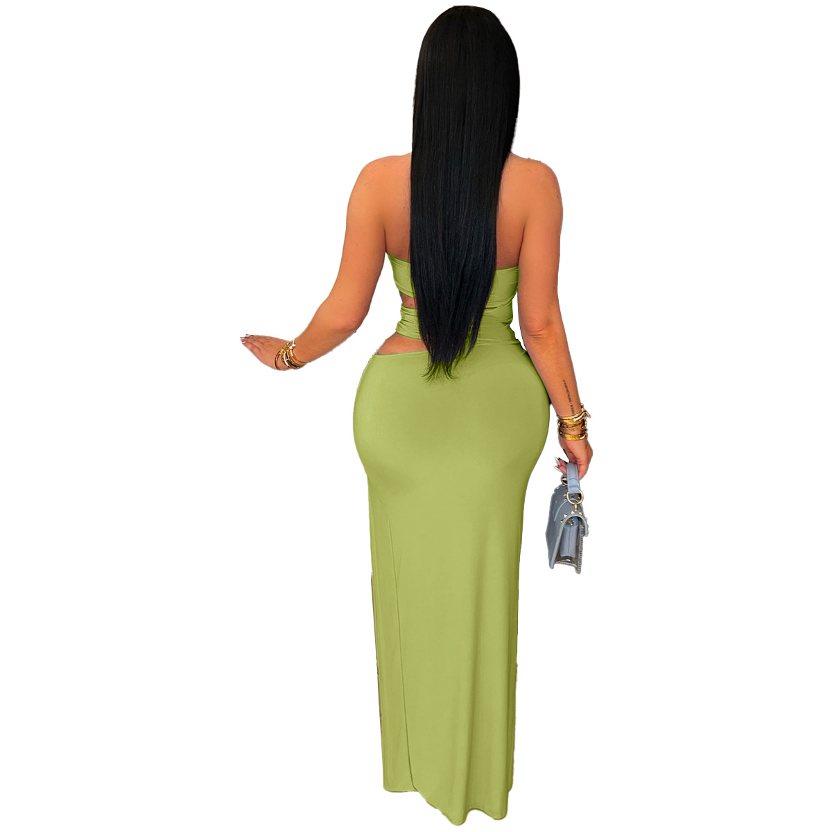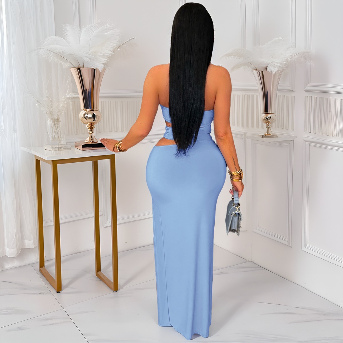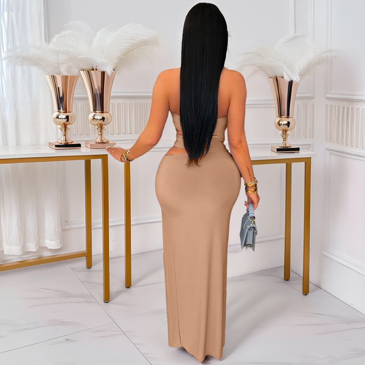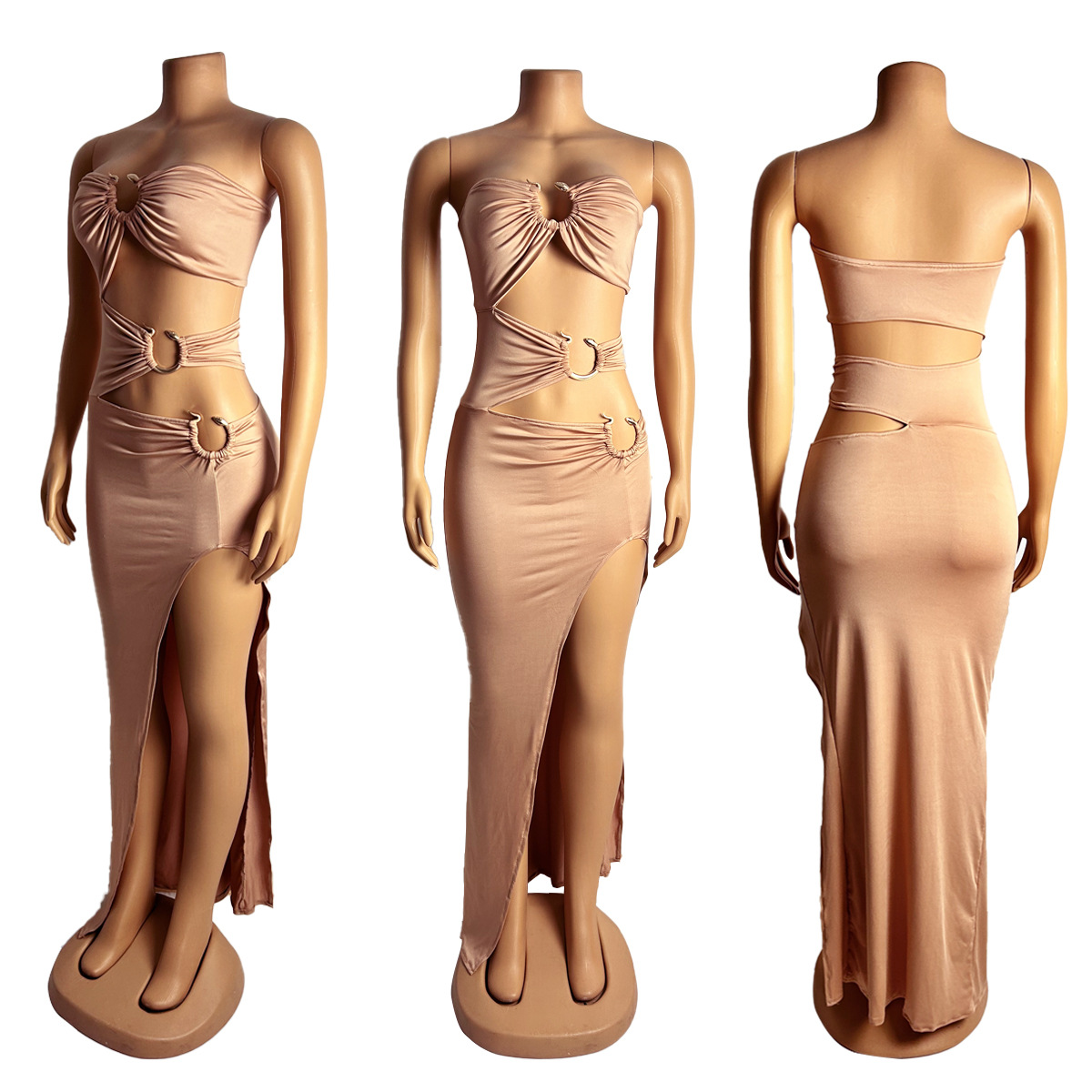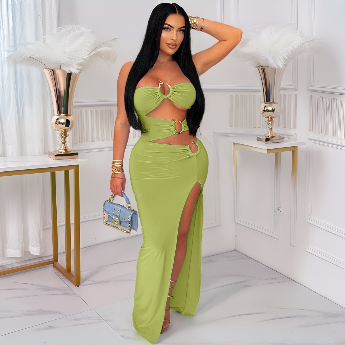 This Women Sexy Cutout Metallic Patchwork Slit Bodycon Maxi Dress Design Made Of Good Quality Polyester And Spandex Material, Which Is Stretchy, Durable And Comfortable. The Long Evening Dresses And Gowns Is Always The main Choice For All Kinds Of Parties, Cocktail, Prom, Events, And Dating Occasions. Evening Gowns At BamBam Comes With Huge Selections - Sequins, Beaded, Satin, Velvet, Lace.... When You Need retail Evening Dresses, BamBam retail Women Garment Online Shop Is Your One-Stop Online Shopping Choice.