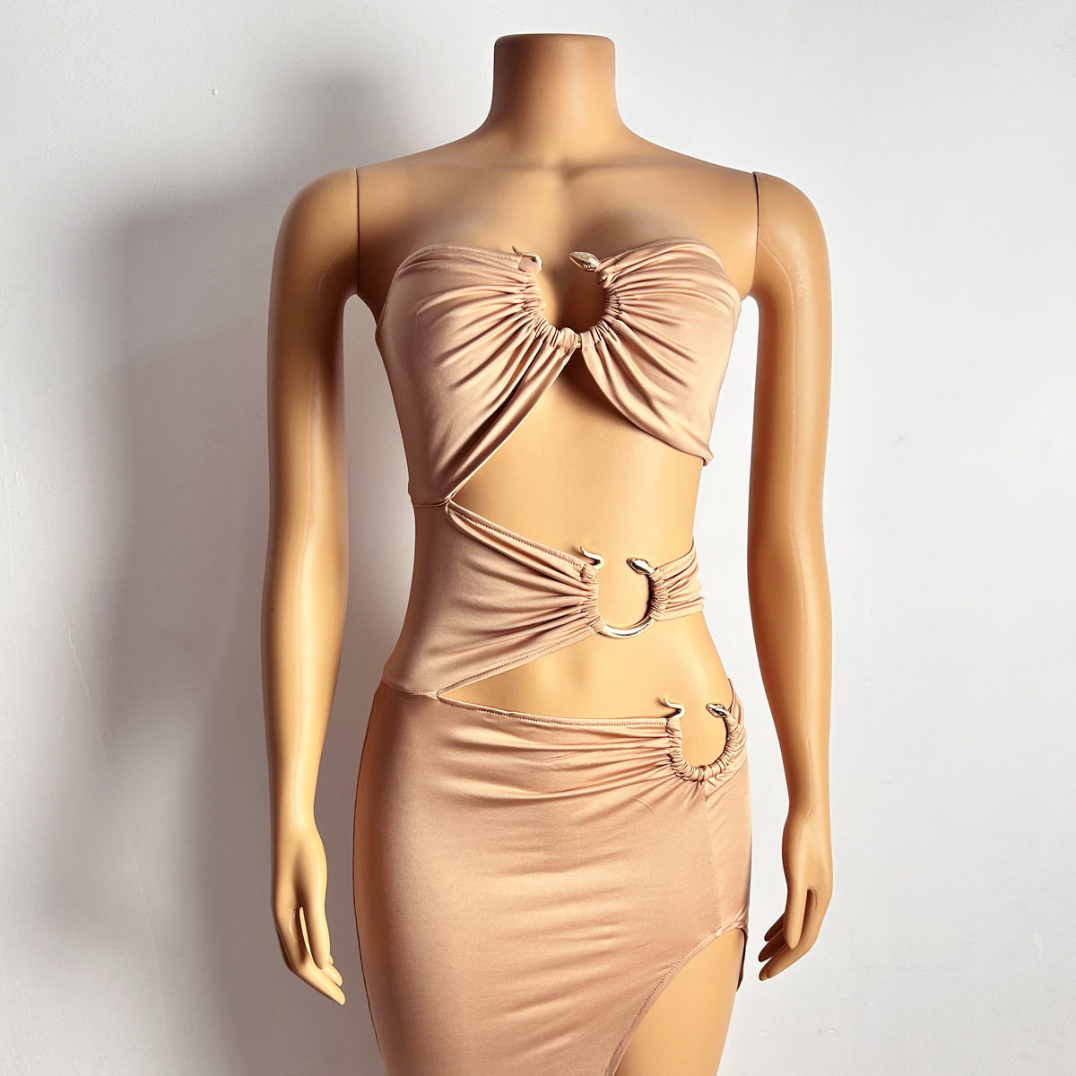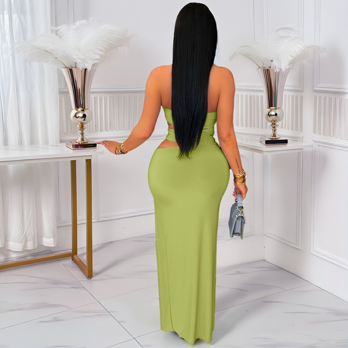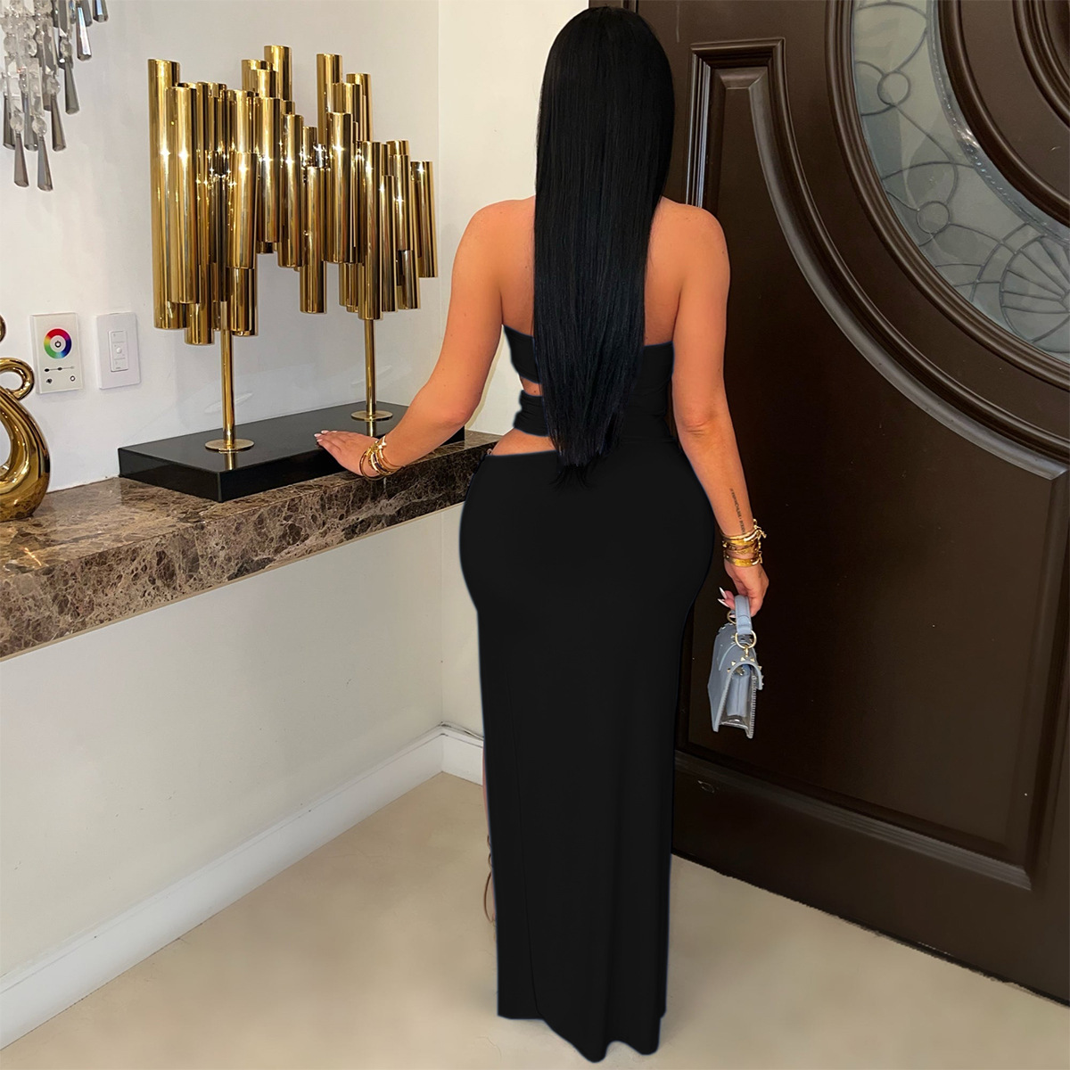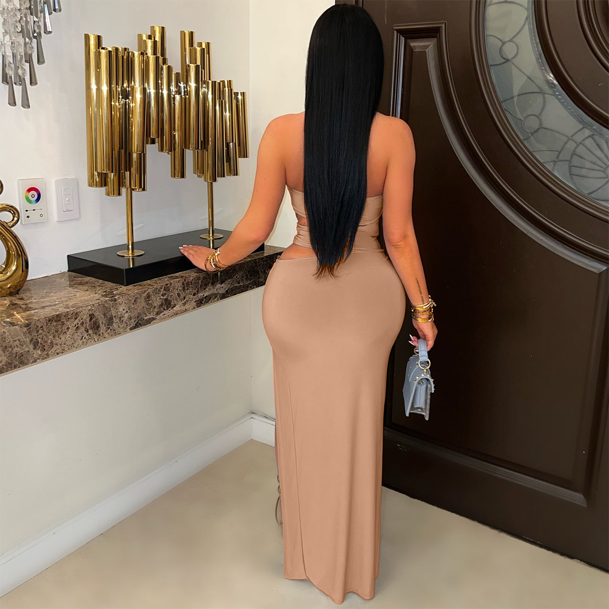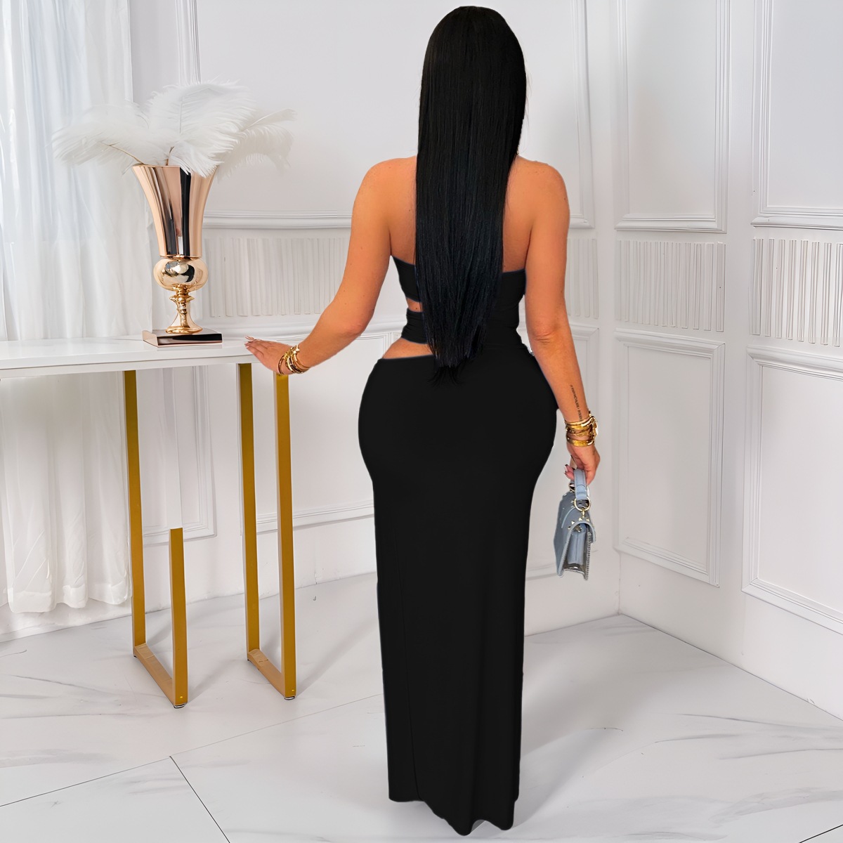This Women Sexy Cutout Metallic Patchwork Slit Bodycon Maxi Dress Design Made Of Good Quality Polyester And Spandex Material, Which Is Stretchy, Durable And Comfortable. The Long Evening Dresses And Gowns Is Always The main Choice For All Kinds Of Parties, Cocktail, Prom, Events, And Dating Occasions. Evening Gowns At BamBam Comes With Huge Selections - Sequins, Beaded, Satin, Velvet, Lace.... When You Need retail Evening Dresses, BamBam retail Women Garment Online Shop Is Your One-Stop Online Shopping Choice.