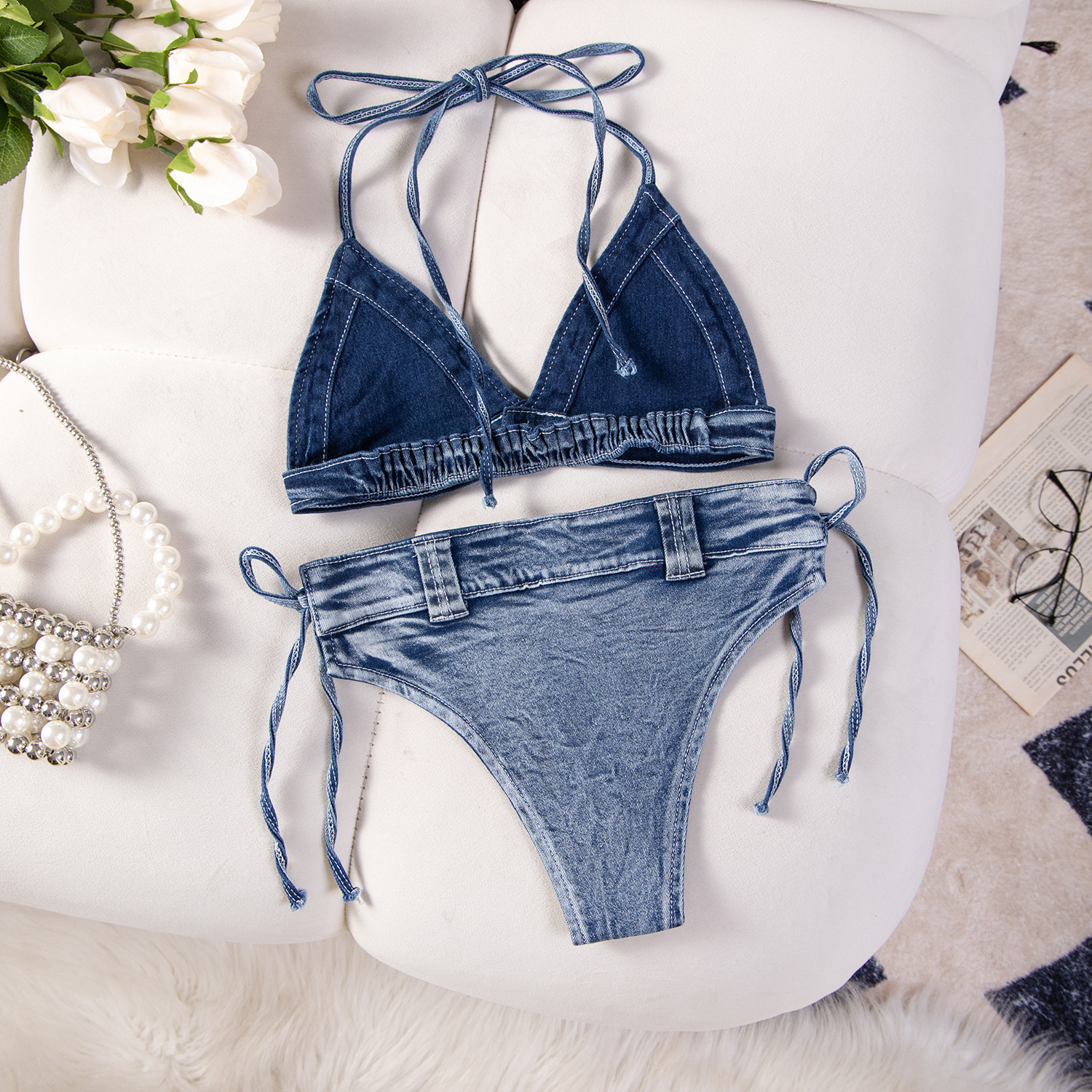 This Women Sexy Denim Bikini Beach Swimwear Two Pieces Design Made Of High Quality polyester And Spandex Material. It Is Stretchy, Durable And Comfortable. It Come With The Top And Shorts. retail Short Sets Saves Some People From The Trouble Of Matching. And For Matchmakers It Is More Flexible Than One-Piece Outfit. Two Piece Short Set Can Be Worn Together Or Individually, Ladies Can Match Them According To Different Occasions. Grab Different Two Piece Short Sets For This Spring And Summer.