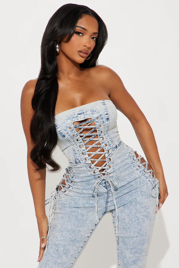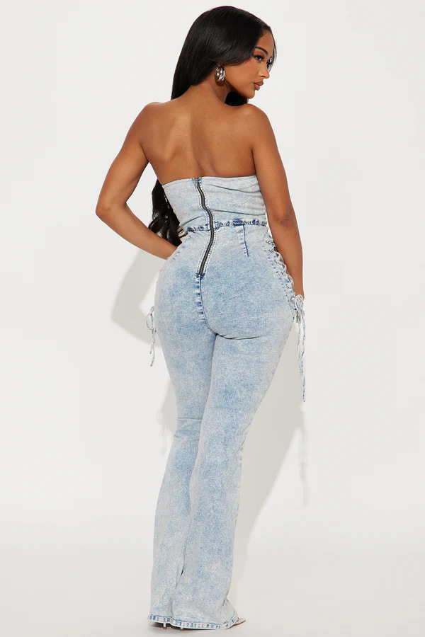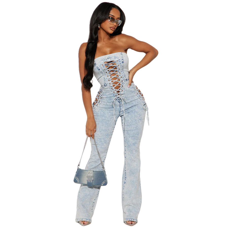 This Women Sexy Lace-Up Strapless Washed Denim Jumpsuit Design Made Of High Quality Polyster And Spandex Material. It Is Stretchy, Durable And Comfortable. Affordable Sexy Jumpsuits For Women Has Long Been a Party Favorite. BamBam provides a Rich selection Of Sequin, Beaded, See Through Mesh, Leopard, Floral Lace, Leather, Velvet, Tight And Fitted retail Jumpsuit Without Moq Limit.