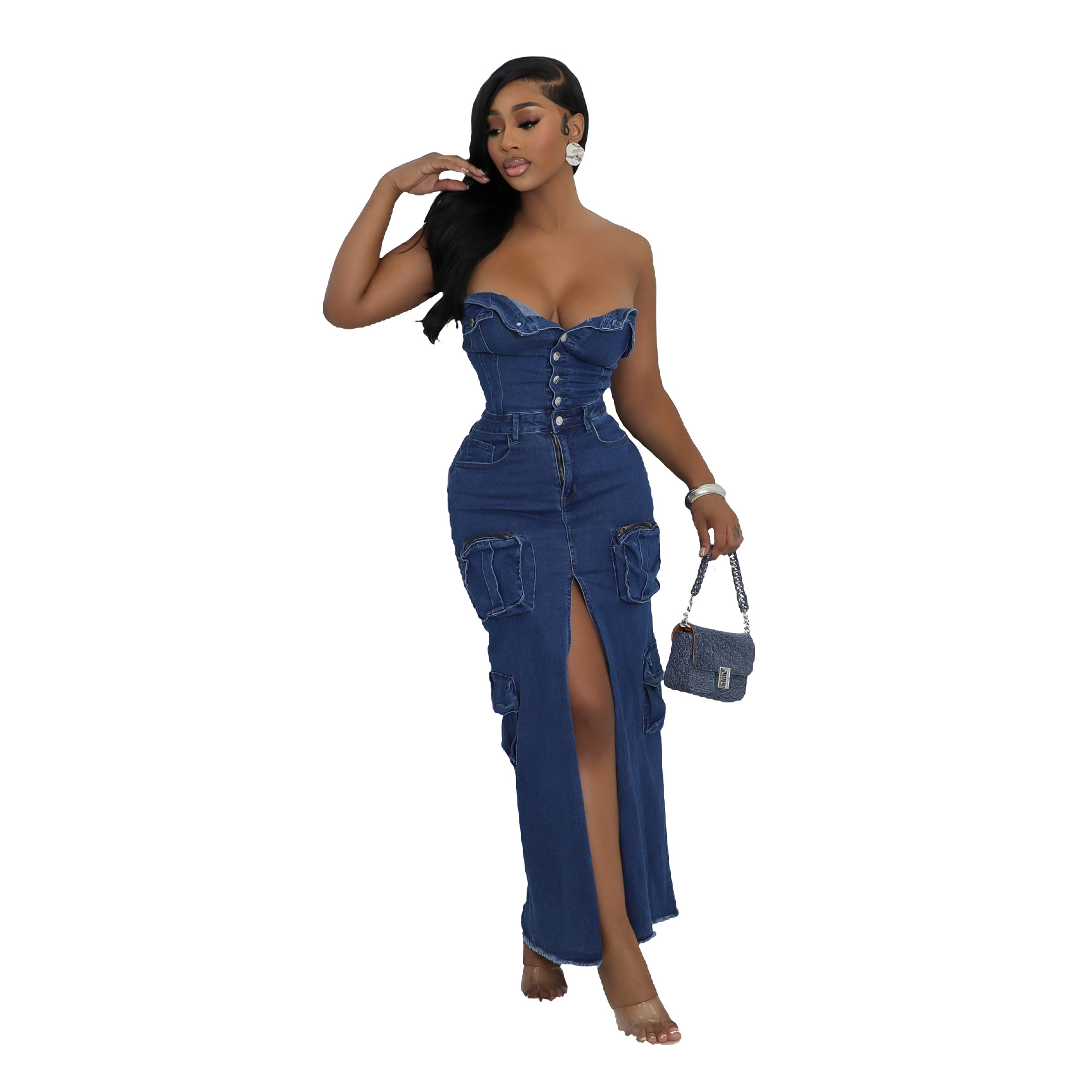 This Women Sexy Strapless Off Shoulder Slit Cargo Denim Dress Design Made Of High Quality polyester And Spandex Material. It smooth and stretchy And wears comfortably with a keen sense of freedom and ease. The Tight And Fitted Dress Is The Most Popular dress option for those that like to party hard. Shop Bodycon Dresses At BamBam And Find Amazing Designs Sequins, Beaded, Diamond, Crystals, Lace... BamBam retail Women Dresses Online Store is your one stop shop that helps By Providing Vary Dresses At quality and afforable prices with limitless variations.