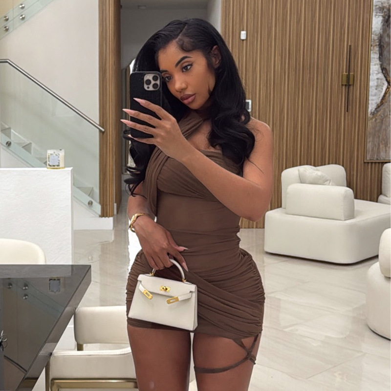 This Women Solid Mesh Halter Neck Backless Asymmetric Gathered Bodycon Dress Design Made Of High Quality polyester And Spandex Material. It smooth and stretchy And wears comfortably with a keen sense of freedom and ease. The Tight And Fitted Dress Is The Most Popular dress option for those that like to party hard. Shop Bodycon Dresses At BamBam And Find Amazing Designs Sequins, Beaded, Diamond, Crystals, Lace... BamBam retail Women Dresses Online Store is your one stop shop that helps By Providing Vary Dresses At quality and afforable prices with limitless variations.