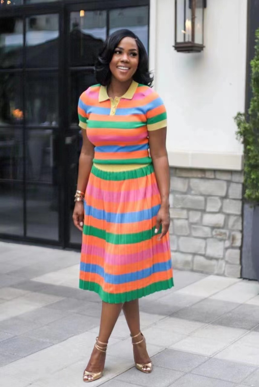 This Women Spring And Autumn Rainbow Striped Short Sleeve Top + Pleated Skirt Two-Piece Set Design Made Of High Quality polyester And Spandex Material. It Is Stretchy, Durable And Comfortable. It Come With The Top And Skirt Matching Set. Women’s Skirt Suit Sets Is a Great Alternative To One Piece Outfit. It Can Either Be Worn Together Or Individually, So You Can Combine Them Endlessly. Grab Different Two Piece Skirt Set retail On Our Website a Women's Clothing Store Online At Really affordable price And Enjoy fast delivery worldwide.