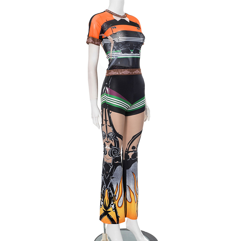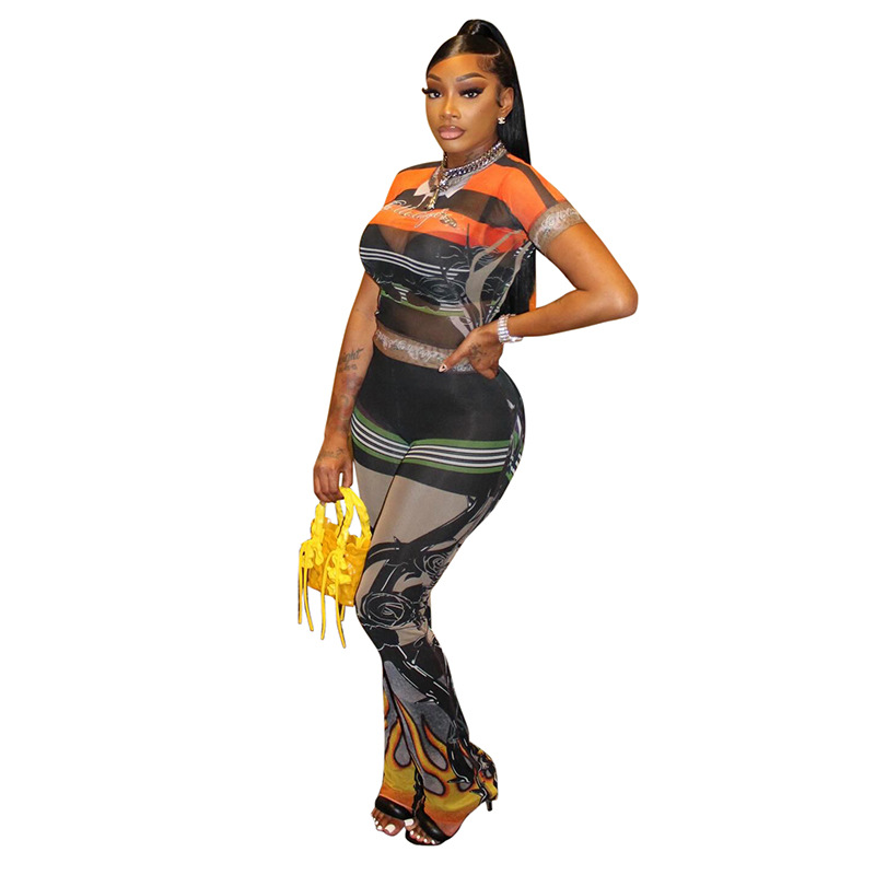 This Women Spring And Summer Print See-Through Mesh Round Neck Top And Bell Bottom Pants Two-Piece Set Design Made Of High Quality polyester And Spandex Material. It Is Stretchy, Durable And Comfortable. It Is a Must-Have Outfit For All Seasons. retail Two Piece Pant Sets Can Solve Your cloth selection Troubles. Explore More 2 Piece Pants Set On BamBam retail Women Clothing Online Store.