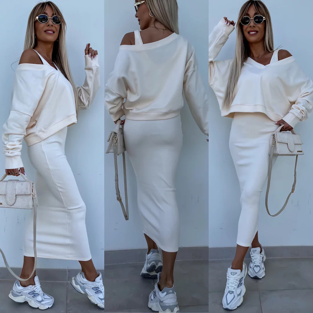 This Women Spring And Summer Solid v Neck Long Sleeve Top And Suspender Dress Two-Piece Set Design Made Of High Quality polyester And Spandex Material. It Is Stretchy, Durable And Comfortable. Casual Dresses With Long Sleeves Can Not Only Be Worn As Outerwear In Spring And Autumn, But Also Matching a Jacket In Winter, It Is a Must Have Item For Every Season. Grab Really Great Buy Casual Dresses For Women And Grow Your Business. No Moq In BamBam.