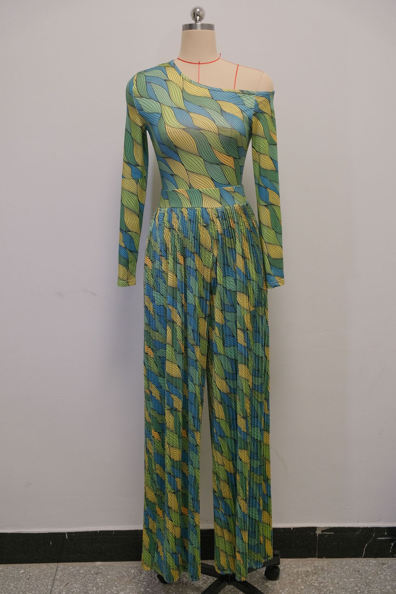 This Women Spring Print Slash Shoulder Long Sleeve Top And Wide Leg Pants Pleated Two-Piece Set Design Made Of High Quality polyester And Spandex Material. It Is Stretchy, Durable And Comfortable. It Is a Must-Have Outfit For All Seasons. retail Two Piece Pant Sets Can Solve Your cloth selection Troubles. Explore More 2 Piece Pants Set On BamBam retail Women Clothing Online Store.