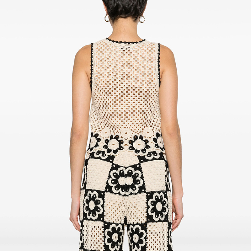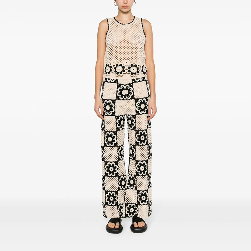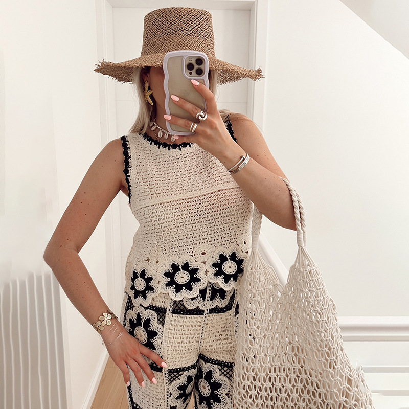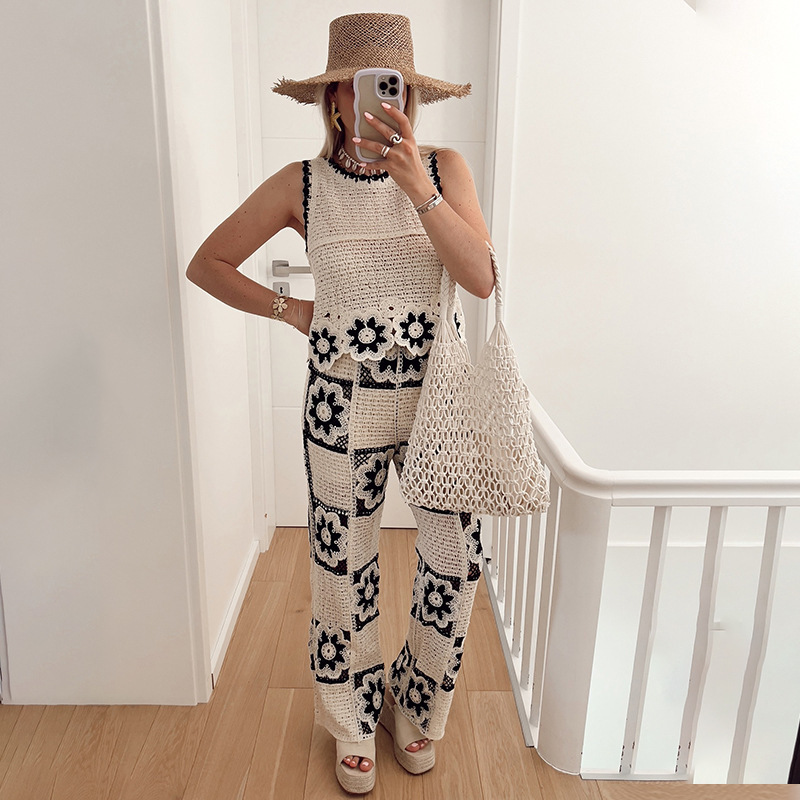 This Women Spring Summer Crochet Hollow Flower Round Neck Sleeveless Knitting Top And Square Wide Leg Pants Two-Piece Set Design Made Of High Quality polyester And Spandex Material. It Is Stretchy, Durable And Comfortable. It Is a Must-Have Outfit For All Seasons. retail Two Piece Pant Sets Can Solve Your cloth selection Troubles. Explore More 2 Piece Pants Set On BamBam retail Women Clothing Online Store.