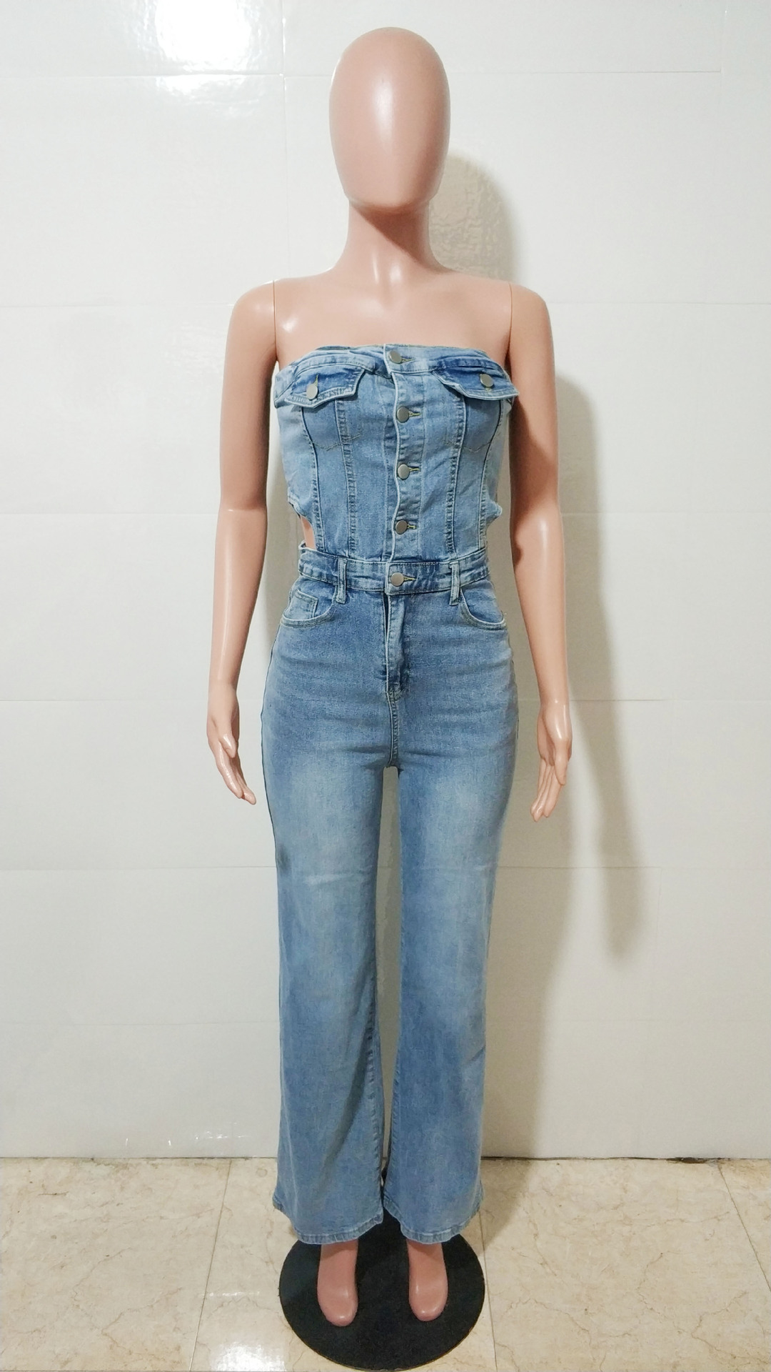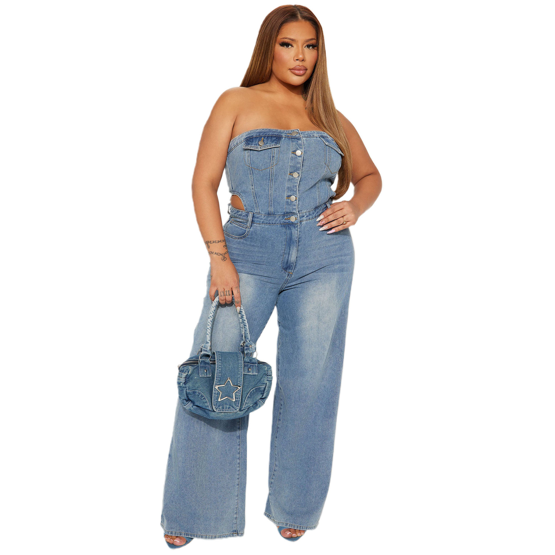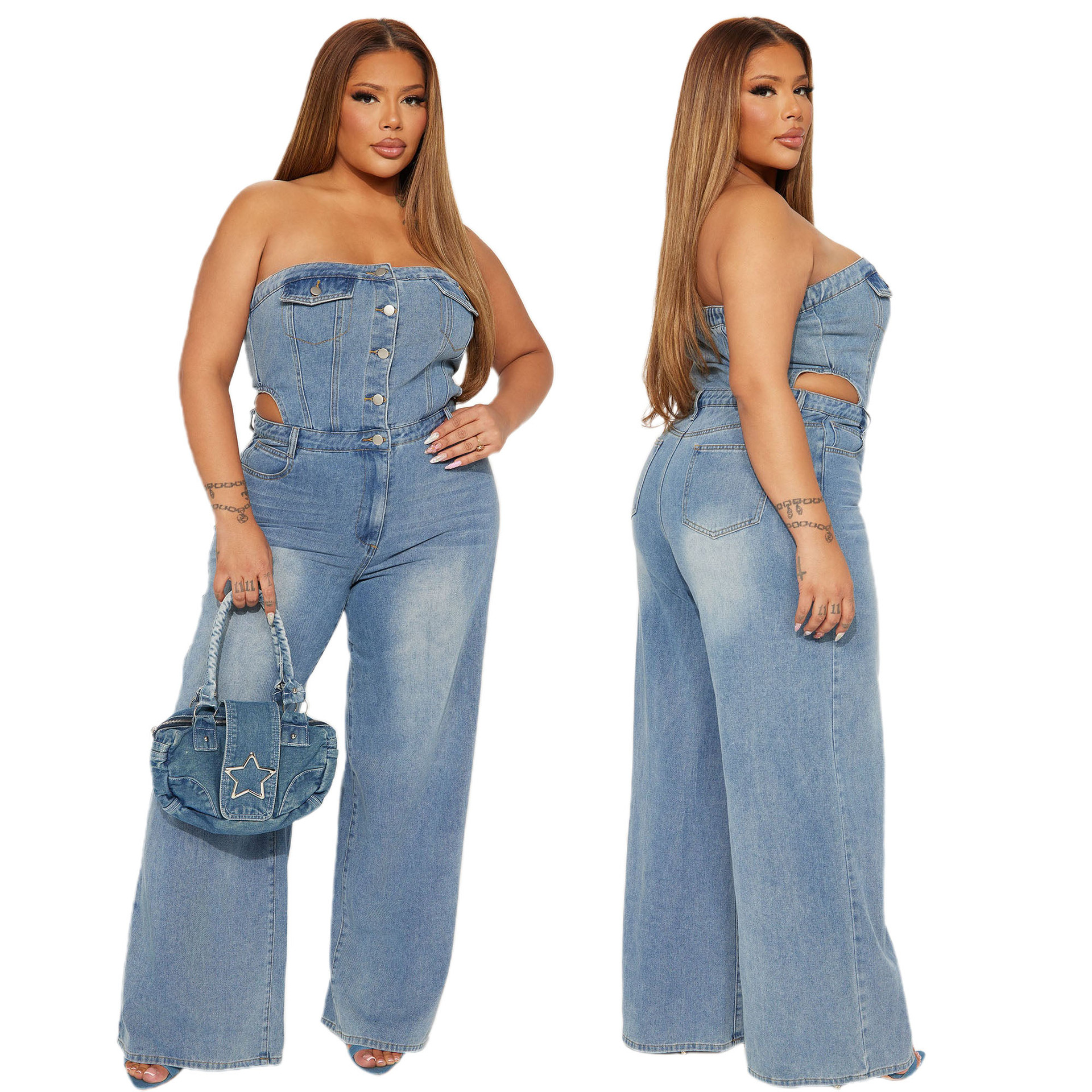 This Women Strapless Off Shoulder Wide Leg Denim Jumpsuit Design Made Of High Quality Polyster And Spandex Material. It Is Stretchy, Durable And Comfortable. Affordable Sexy Jumpsuits For Women Has Long Been a Party Favorite. BamBam provides a Rich selection Of Sequin, Beaded, See Through Mesh, Leopard, Floral Lace, Leather, Velvet, Tight And Fitted retail Jumpsuit Without Moq Limit.