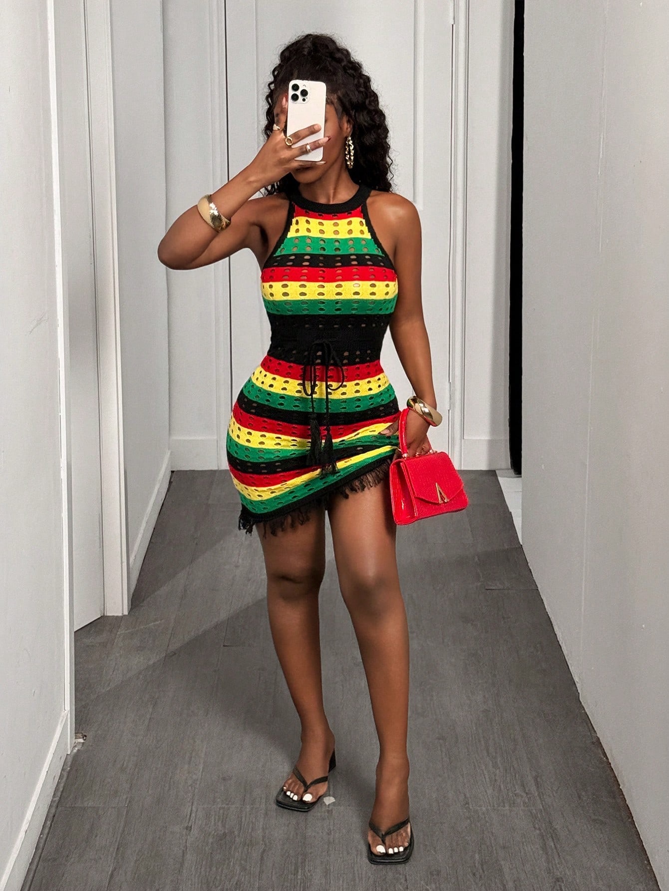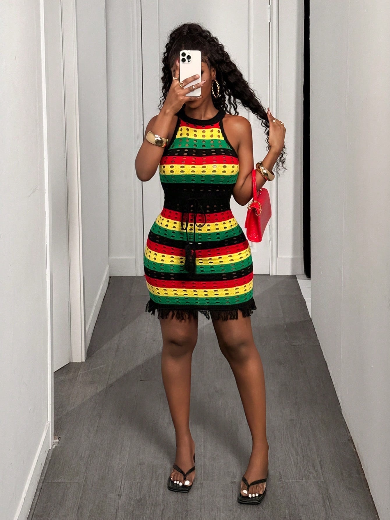 This Women Striped Contrast Color Hollow Drawstring Bodycon Tassel Dress Design Made Of High Quality polyester And Spandex Material. It Is Stretchy, Durable And Comfortable. Casual Dresses With Long Sleeves Can Not Only Be Worn As Outerwear In Spring And Autumn, But Also Matching a Jacket In Winter, It Is a Must Have Item For Every Season. Grab Really Great Buy Casual Dresses For Women And Grow Your Business. No Moq In BamBam.