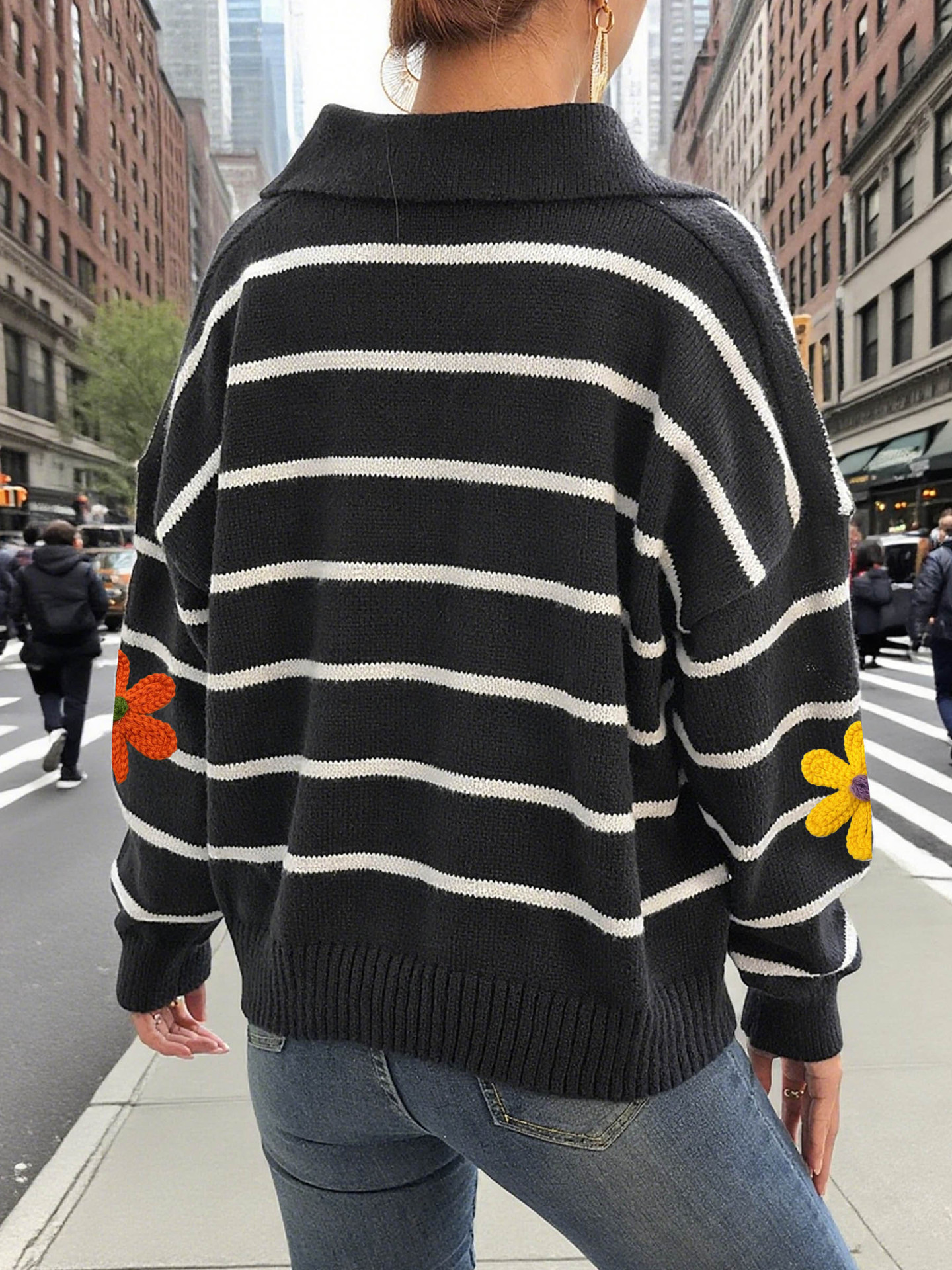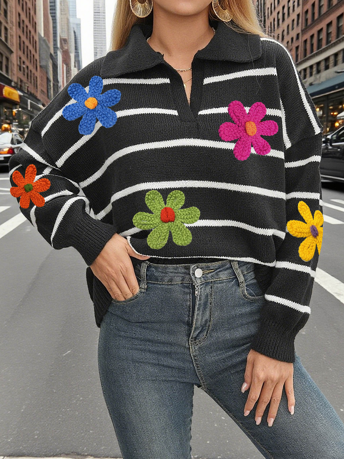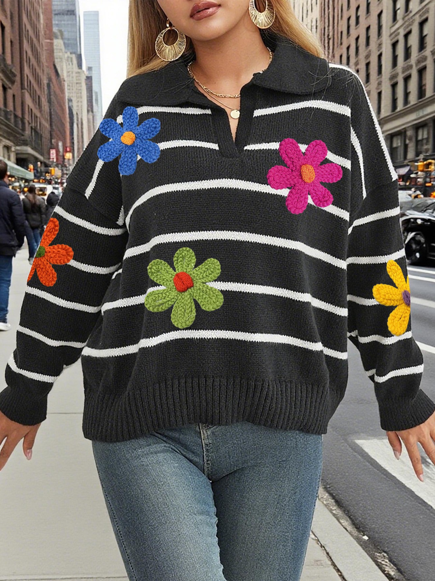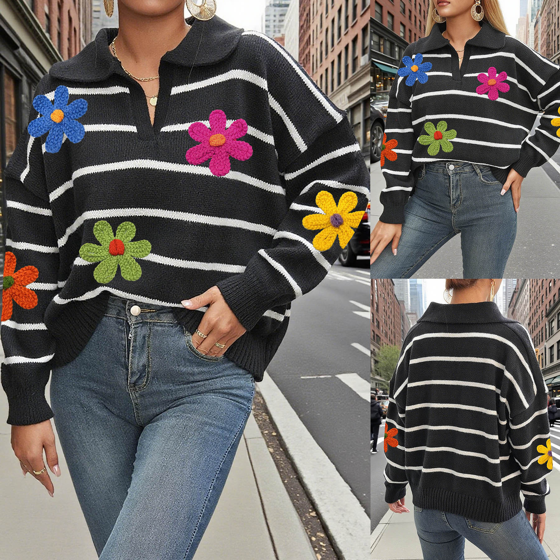 This Women Striped Embroidered Flower Patchwork Polo Neck Sweater Is An Indispensable Beautiful piece to have to keep warm In Cozy Winter. Women’s retail Sweaters And Cardigans At BamBam Combine warmth with Fashion. Best Oversized Sweaters Have Long Been The main Favorite. It’s So Easy To Match a Large Sweater, Sometimes The Coat Can Be Ignored. Oversized Sweater With Short Skirt Is Dignified And Attractive. Oversized Sweater With Skirt Is Elegant And Sweet. Oversized Sweaters With Over-The-Knee Boots Can Easily Create a Sense Of Maturity And Femininity. Oversized Sweaters Paired With Shorts Are Full Of Youthful Vitality And Look More Dynamic And Energetic!