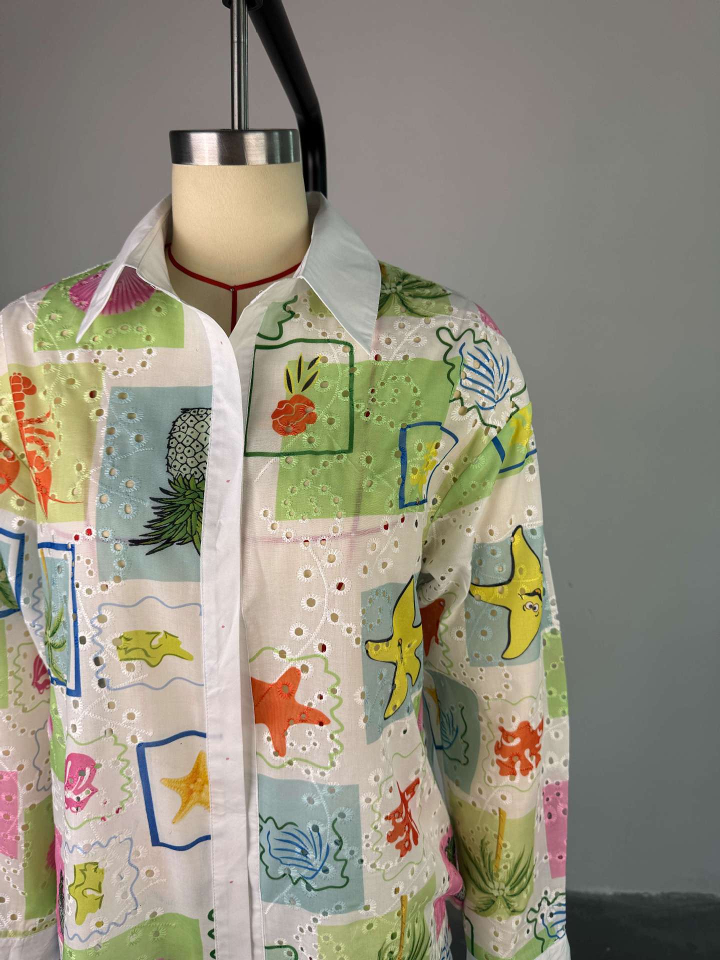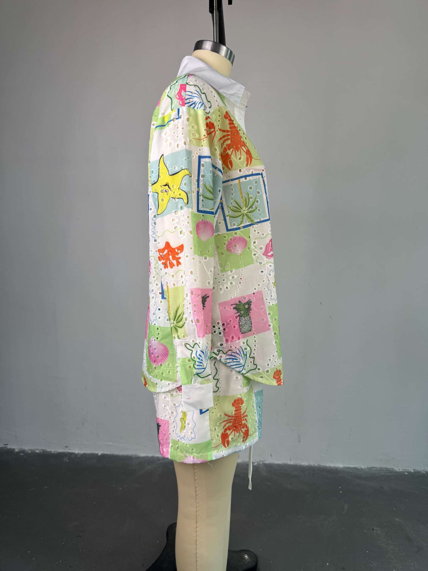 This Women Summer Print Hollow Turndown Collar Long Sleeve Shirt And Shorts Casual Two-Piece Set Design Made Of High Quality polyester And Spandex Material. It Is Stretchy, Durable And Comfortable. It Come With The Top And Shorts. retail Short Sets Saves Some People From The Trouble Of Matching. And For Matchmakers It Is More Flexible Than One-Piece Outfit. Two Piece Short Set Can Be Worn Together Or Individually, Ladies Can Match Them According To Different Occasions. Grab Different Two Piece Short Sets For This Spring And Summer.