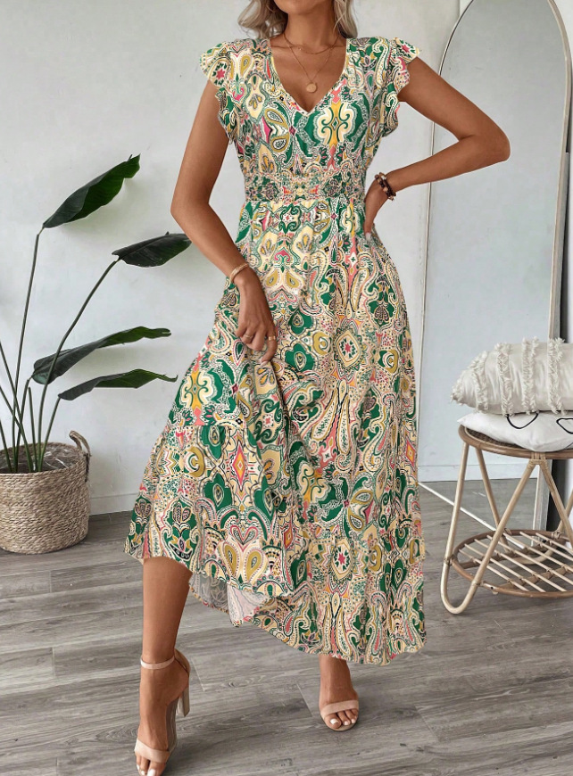 This Women Summer Printed v-Neck Ruffled Maxi Dress Design Made Of High Quality polyester And Spandex Material. It Is Stretchy, Durable And Comfortable. Casual Dresses With Long Sleeves Can Not Only Be Worn As Outerwear In Spring And Autumn, But Also Matching a Jacket In Winter, It Is a Must Have Item For Every Season. Grab Really Great Buy Casual Dresses For Women And Grow Your Business. No Moq In BamBam.