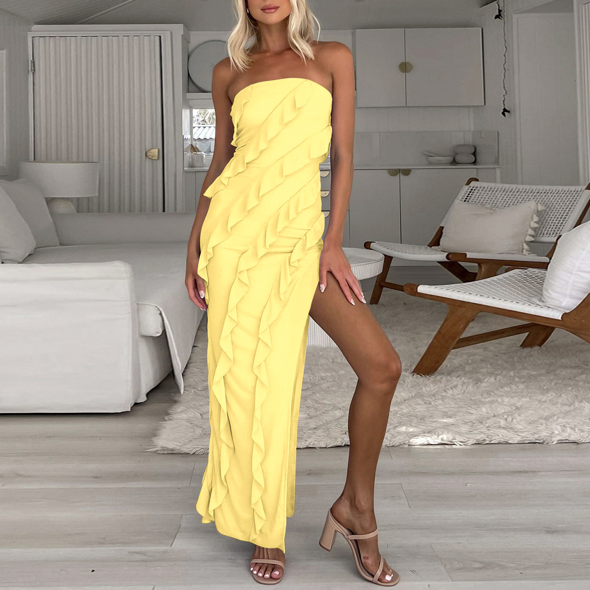 This Women Summer Sexy Side Slit Irregular Bodycon Strapless Dress Design Made Of Good Quality Polyester And Spandex Material, Which Is Stretchy, Durable And Comfortable. The Long Evening Dresses And Gowns Is Always The main Choice For All Kinds Of Parties, Cocktail, Prom, Events, And Dating Occasions. Evening Gowns At BamBam Comes With Huge Selections - Sequins, Beaded, Satin, Velvet, Lace.... When You Need retail Evening Dresses, BamBam retail Women Garment Online Shop Is Your One-Stop Online Shopping Choice.