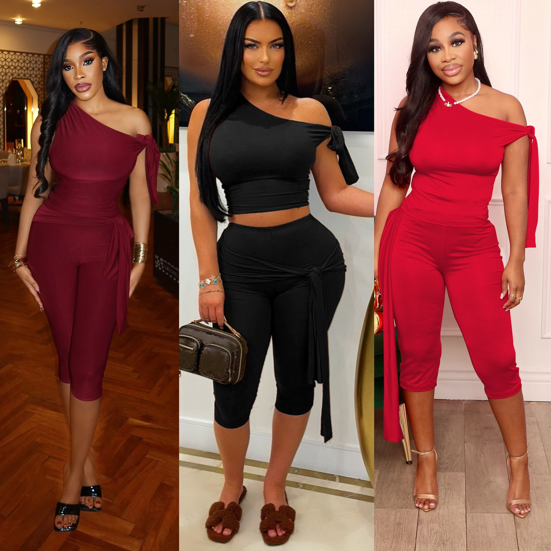 This Women Summer Slash Shoulder Lace-Up Casual Solid Top And Shorts Two Piece Set Design Made Of High Quality polyester And Spandex Material. It Is Stretchy, Durable And Comfortable. It Come With The Top And Shorts. retail Short Sets Saves Some People From The Trouble Of Matching. And For Matchmakers It Is More Flexible Than One-Piece Outfit. Two Piece Short Set Can Be Worn Together Or Individually, Ladies Can Match Them According To Different Occasions. Grab Different Two Piece Short Sets For This Spring And Summer.