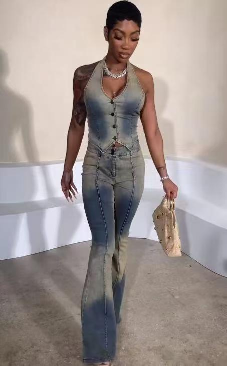 This Women Summer Sleeveless Denim Vest And Pants Two-Piece Set Design Made Of High Quality polyester And Spandex Material. It Is Stretchy, Durable And Comfortable. It Is a Must-Have Outfit For All Seasons. retail Two Piece Pant Sets Can Solve Your cloth selection Troubles. Explore More 2 Piece Pants Set On BamBam retail Women Clothing Online Store.