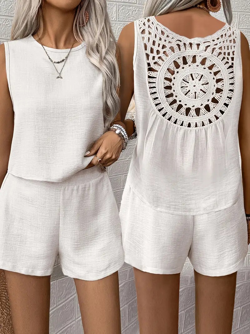 This Women Summer Sleeveless Solid Hollow Lace Top And Shorts Two Piece Design Made Of High Quality polyester And Spandex Material. It Is Stretchy, Durable And Comfortable. It Come With The Top And Shorts. retail Short Sets Saves Some People From The Trouble Of Matching. And For Matchmakers It Is More Flexible Than One-Piece Outfit. Two Piece Short Set Can Be Worn Together Or Individually, Ladies Can Match Them According To Different Occasions. Grab Different Two Piece Short Sets For This Spring And Summer.