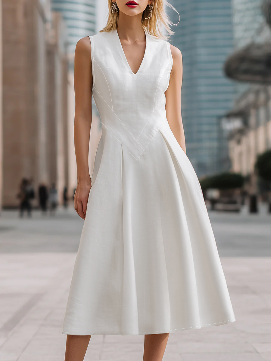 This Women Summer Solid White v-Neck Sleeveless Dress Design Made Of High Quality polyester And Spandex Material. It's nice and stretchy, feels and wears comfortably on your body. Women’s Midi dresses suits all Kinds Of Occasions - Daily Wear, Go To The Church, Commuting And Events Occasion. Midi Dresses can't be Boring, Find Best Midi Dresses At BamBam With Trendy Styles.